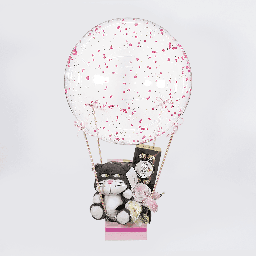 Arreglo burbuja con peluche y chocolate. Incluye globo burbuja que se puede perzonalizar con frase de 3 palabras