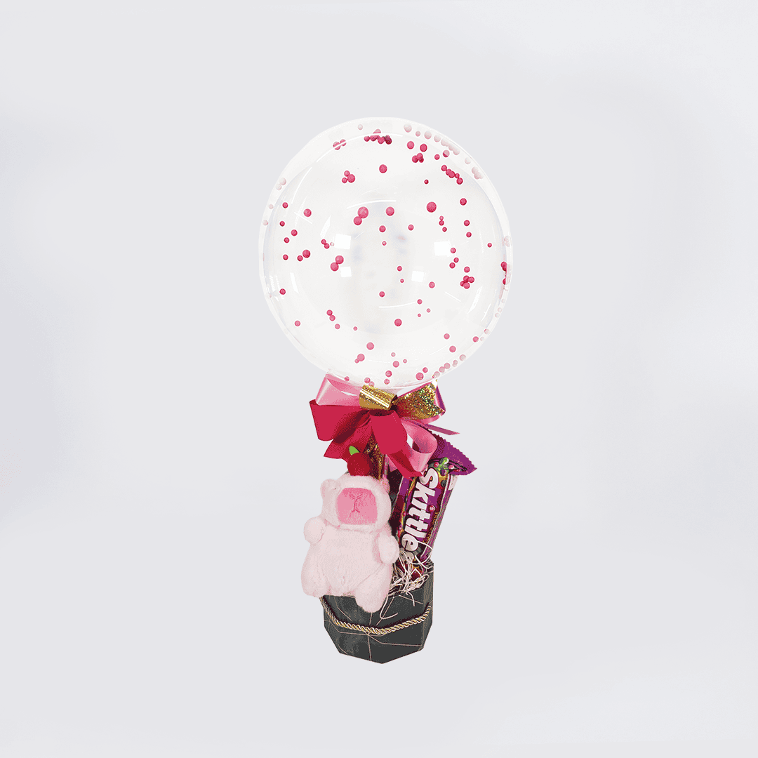 Arreglo capibara rosa con globo burbuja que se puede perzonalizar con frase de 3 palabras