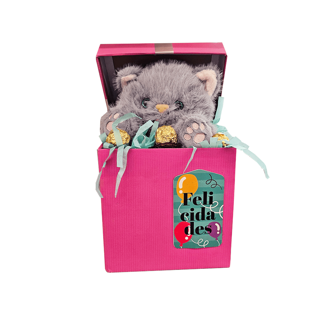 Caja de carton color fucsia con frase la de FELICIDADES en la parte de enmedio con peluche de gatito gris con 3 chocolates Ferrero.Nota: Dependiendo disponibilidad en tienda pueden cambiar el peluche, los chocolates y el color de la caja de carton
