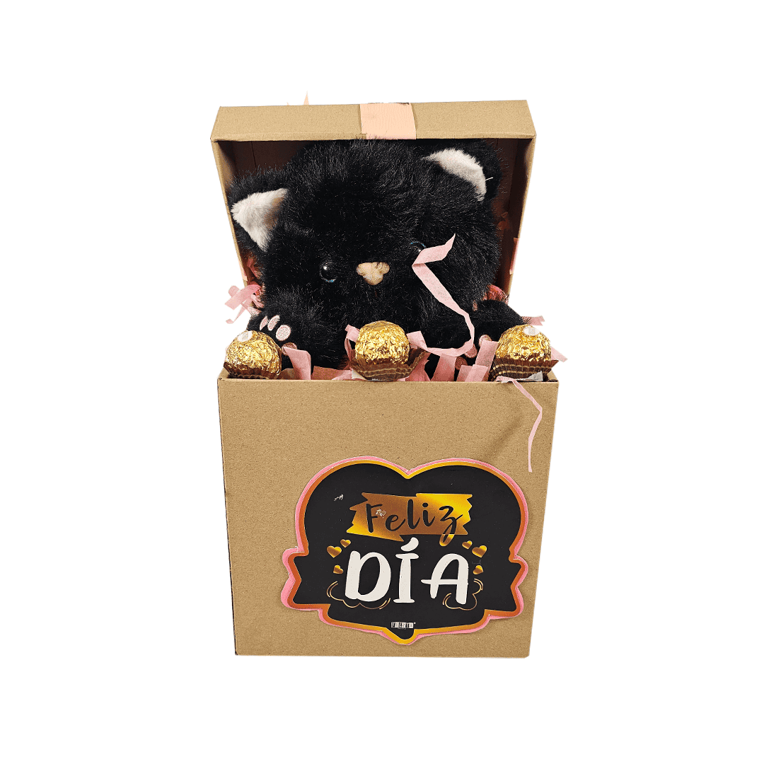 Caja de carton con frase la de FELIZ día en la parte de enmedio con peluche de gatito negro con 3 chocolates Ferrero.Nota: Dependiendo disponibilidad en tienda pueden cambiar el peluche, los chocolates y el color de la caja de carton