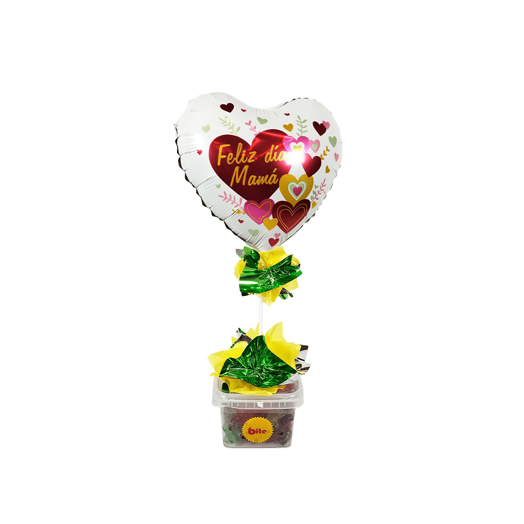 Arreglo del día de la Madre con base de caja de gomitas bite, papel metalico y globo mini shape con leyenda. Nota: dpeendiendo disponibilidad de tienda puede variar el diseño de globo, color del papel y sabor de gomitas