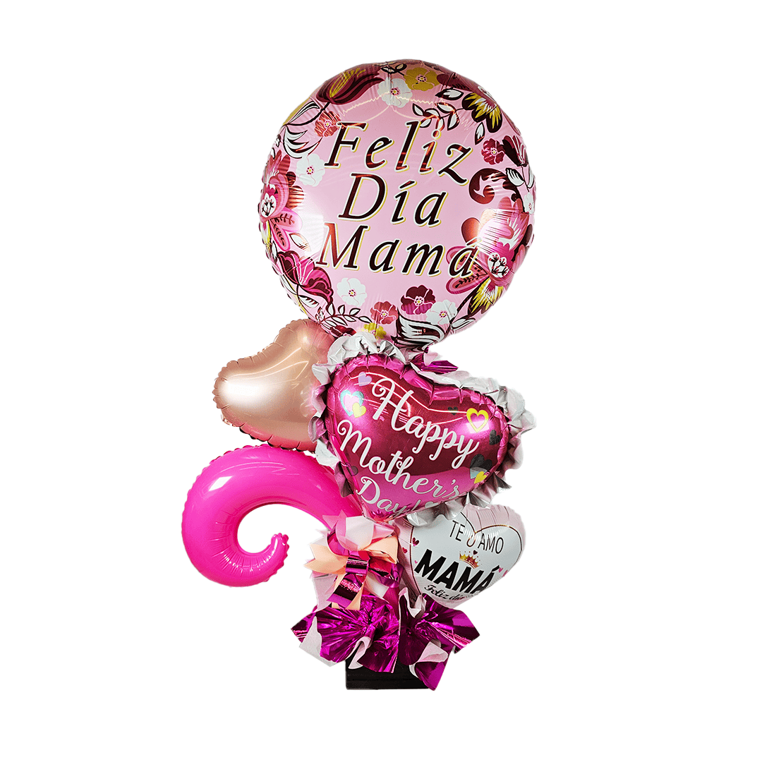 Arreglo de globo metalico de 35″ con leyenda, 4 globos mini shapes, decoracion en la parte de abajo de papel metalico y base cuadrada. Nota: los globos pueden variar dependiendo disponibilidad en tienda.