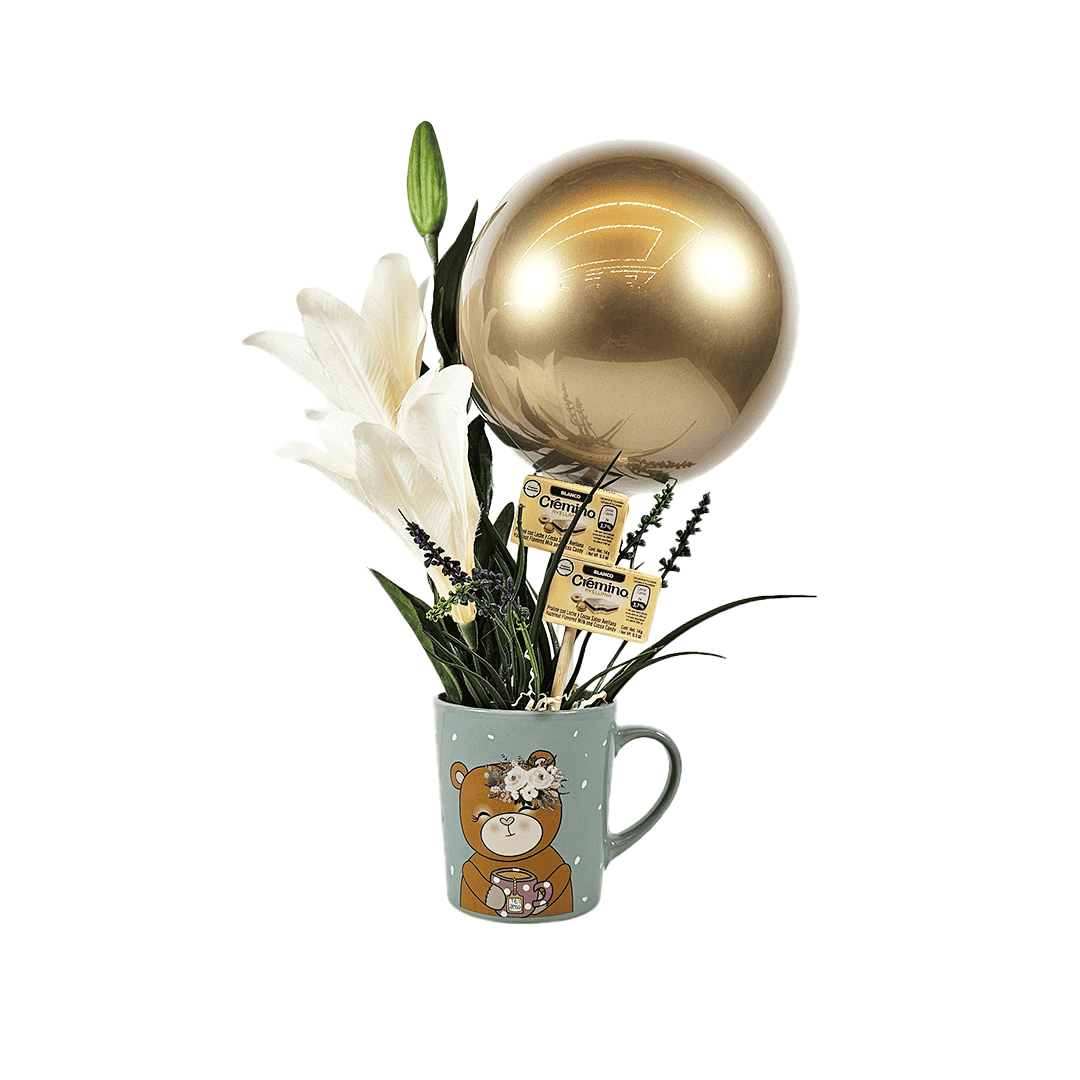 Tasa con diseño de osito con 2 chocolates cremosos y un globo burbuja con un ramo de lirios artificial. Nota: puede cambiar tasa, color de globo y flores dependiendo disponibilidad en tienda