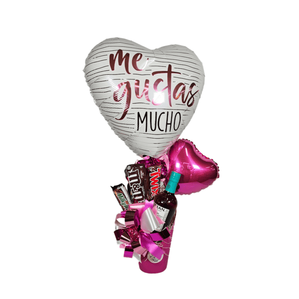 Arreglo especial globo con ron. Incluye: Globo metálico de 35″, minishape, botella ron botran, 3 chocoalates surtidos, moña y base de cartón, puede agregar una tarjetita de/para con dedicatoria. Nota: Este arreglo puede variar según disponibilidad en tienda.