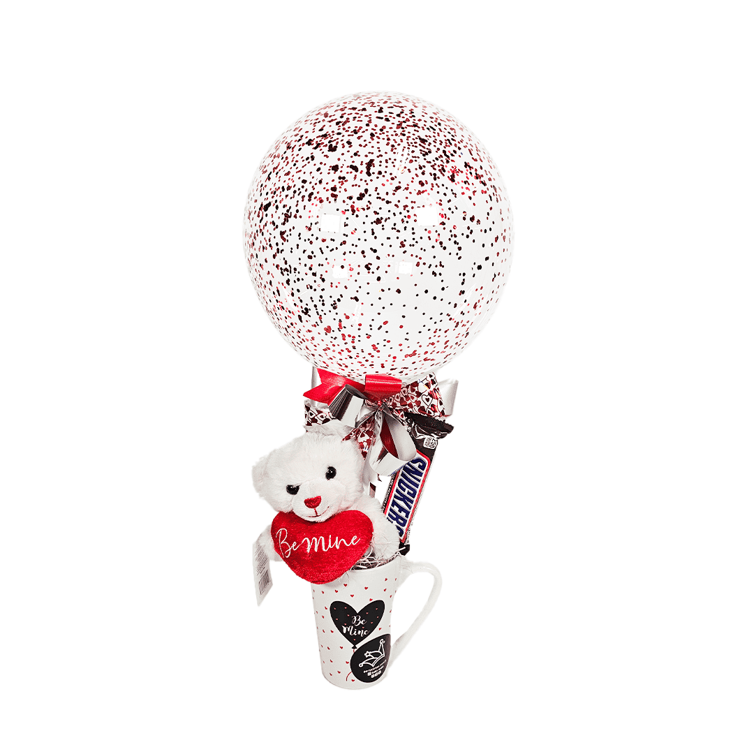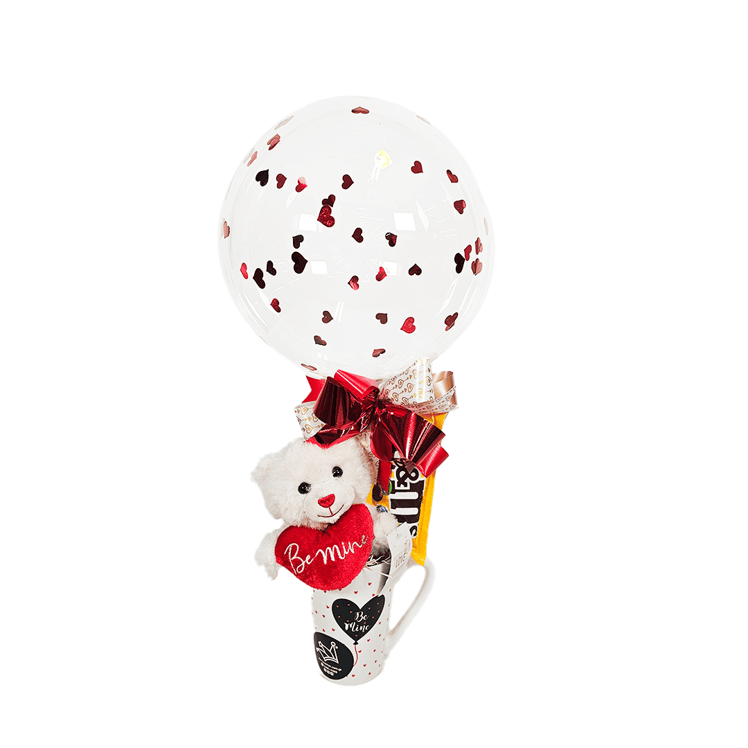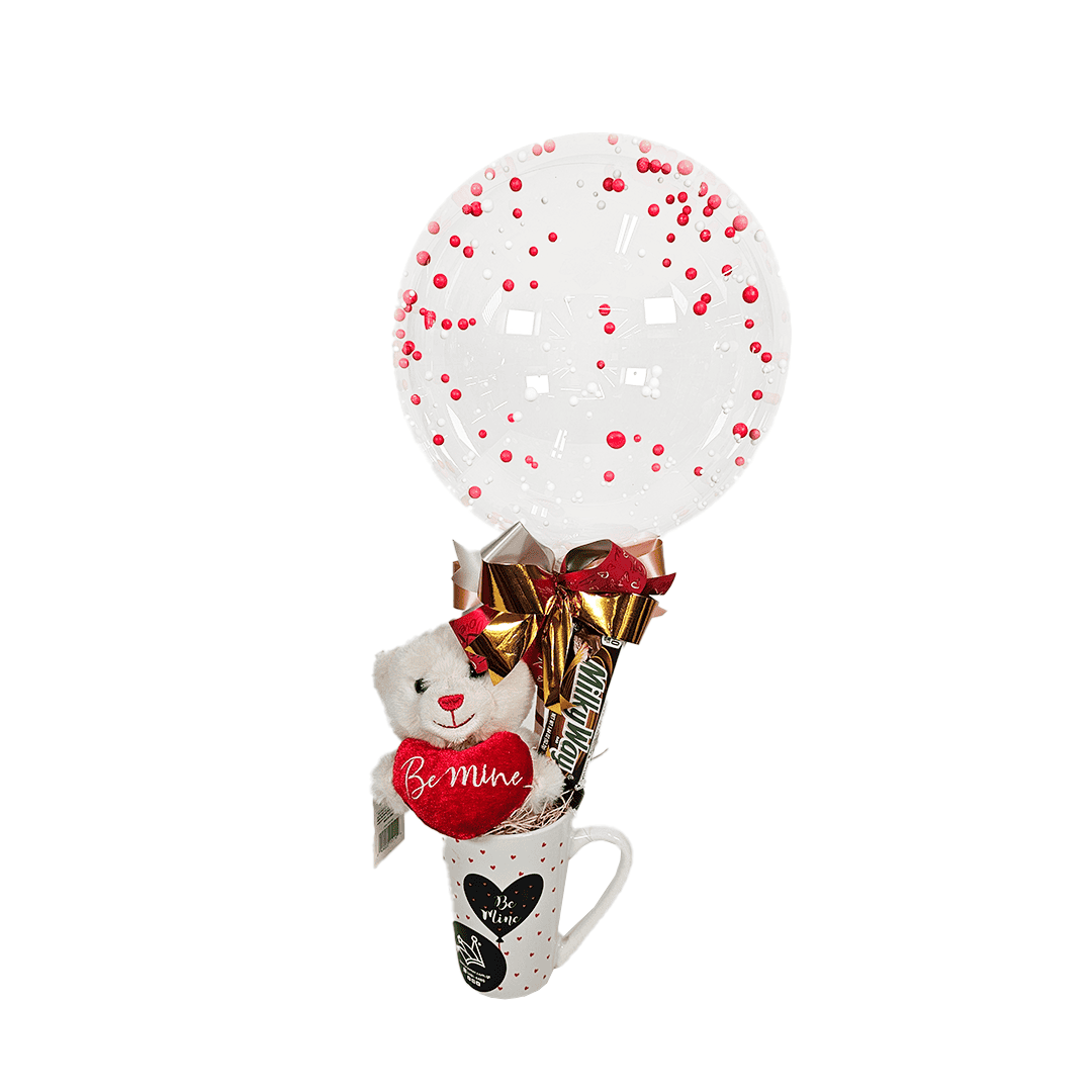 Arreglo especial taza con peluche. Incluye: mini globo burbuja (puede personalizarse con frase de 3 palabras), peluche de oso, 1 paquete de chocolates/dulces, moña y taza. Puede agregar una tarjetita de/para con dedicatoria. Nota: Este producto es de presentación surtida, por lo que podría recibir cualquiera de sus variaciones. Si prefiere un color específico, indícalo en su pedido; se enviará según disponibilidad.