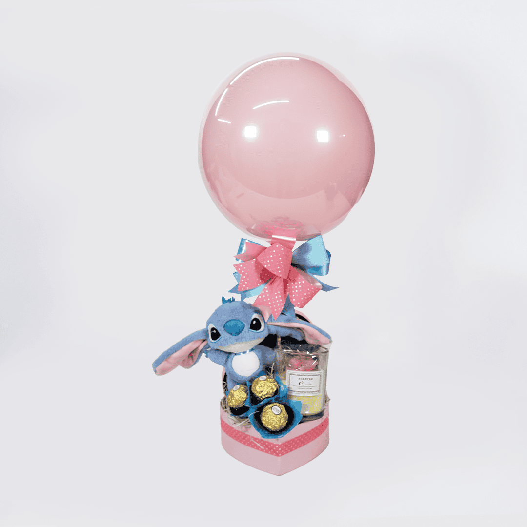 Arreglo Mini Stitch. Incluye globo burbuja que se puede perzonalizar con frase de 3 palabras y chocolates Ferrero Rocher