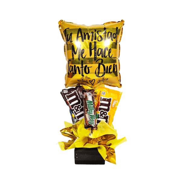 Arreglo MiniShape 3 chocolates, ideal para regalar a un amigo/amiga. Incluye Globo metálico minishape, 3 chocolates/dulces surtidos. Papel coerano/metálico y base de madera, puede agregar una tarjetita de/para con dedicatoria. Nota: Este producto es de presentación surtida, por lo que podría recibir cualquiera de sus variaciones. Si prefiere un color específico, indícalo en su pedido; se enviará según disponibilidad.