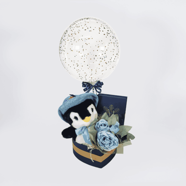 Arreglo Pingüino co chocolate Zurich. Incluye globo burbuja que se puede perzonalizar con frase de 3 palabras