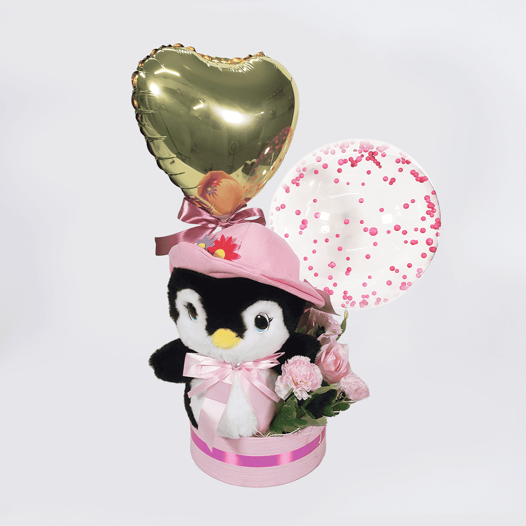 Arreglo rosado con peluche de Pingüino, incluye globo burbuja que se puede perzonalizar con frase de 3 palabras