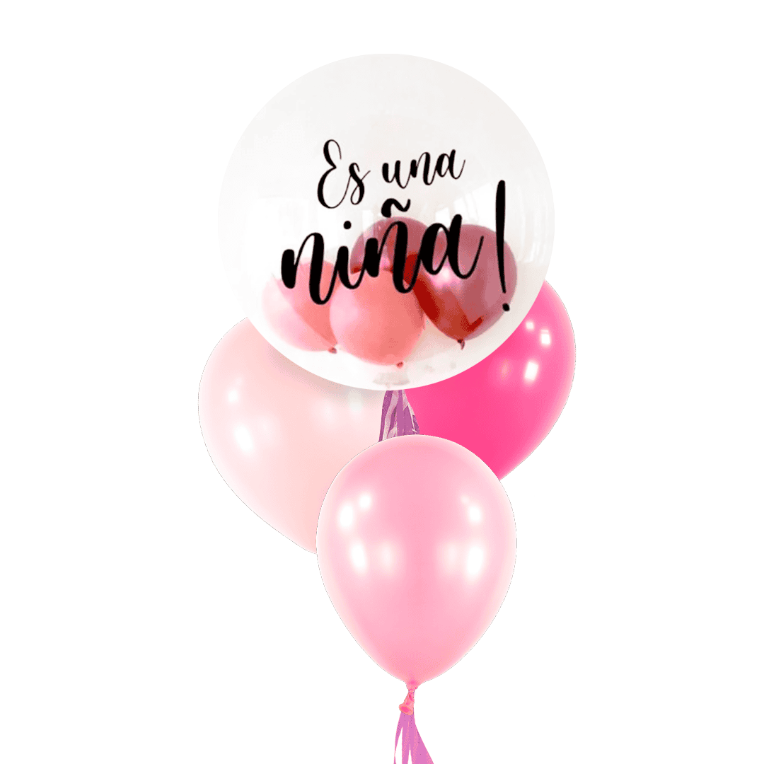 Bunch con helio de globos burbuja (con pintura, confeti, globos o micro perla) con personalizado de tres palabras + tres globos látex de color solido a elección. Incluye peso y tassel. Ideal para baby shower niño, regalo o decoración.