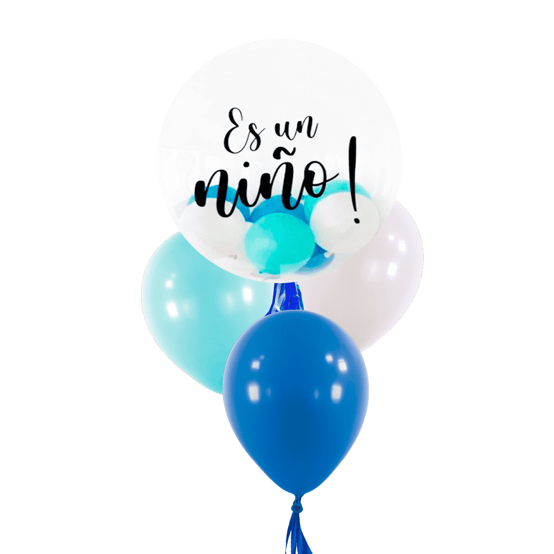 Bunch con helio de globos burbuja (con pintura, confeti, globos o micro perla) con personalizado de tres palabras + tres globos látex de color solido a elección. Incluye peso y tassel. Ideal para baby shower niña, regalo o decoración.