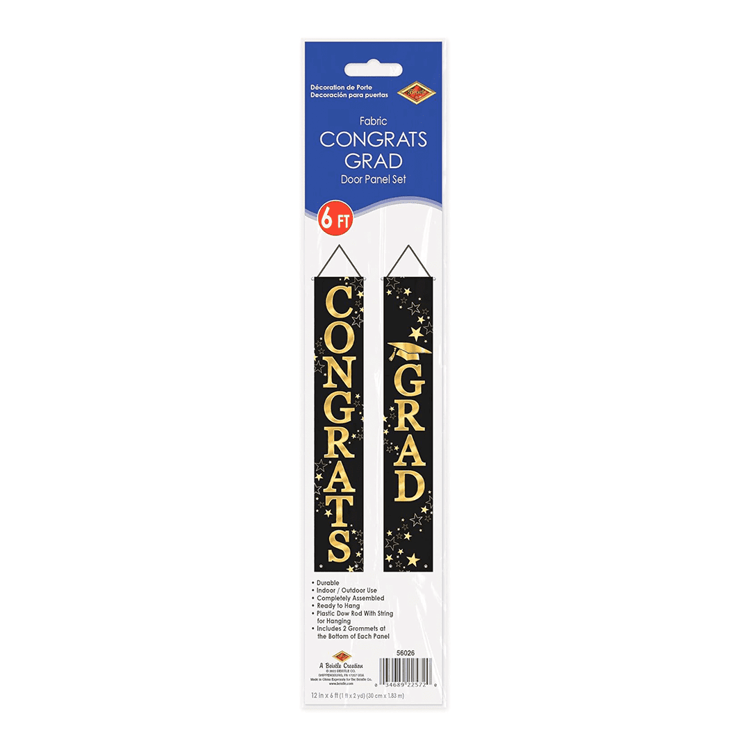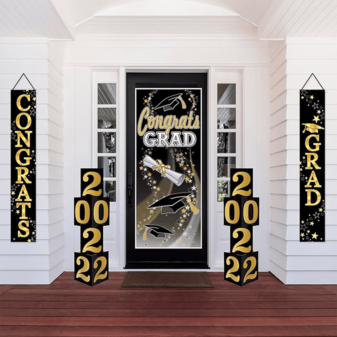Banners de puerta de graduación negros y dorados, paneles de tela Oxford, letreros de porche de felicitaciones para decoraciones de fiesta de graduación, uso en interiores y exteriores.