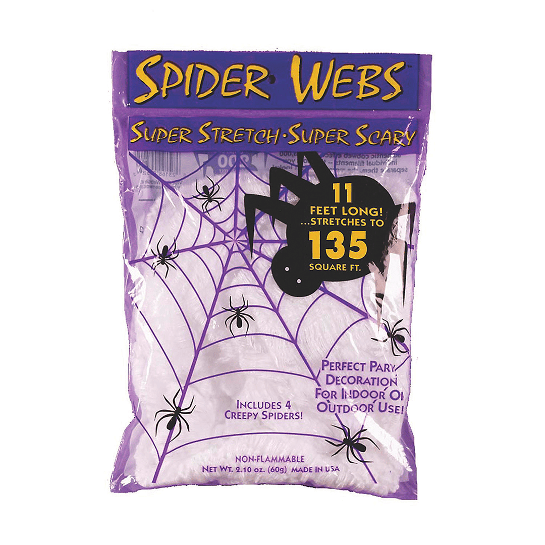 Decoración elástica de telaraña blanca de 3,35 m. ¡Crea la apariencia de un espacio viejo, mohoso y plagado de arañas con estas espeluznantes telarañas elásticas! Estas decoraciones de Halloween escalofriantes son un complemento imprescindible para tu casa embrujada o fiesta de Halloween.