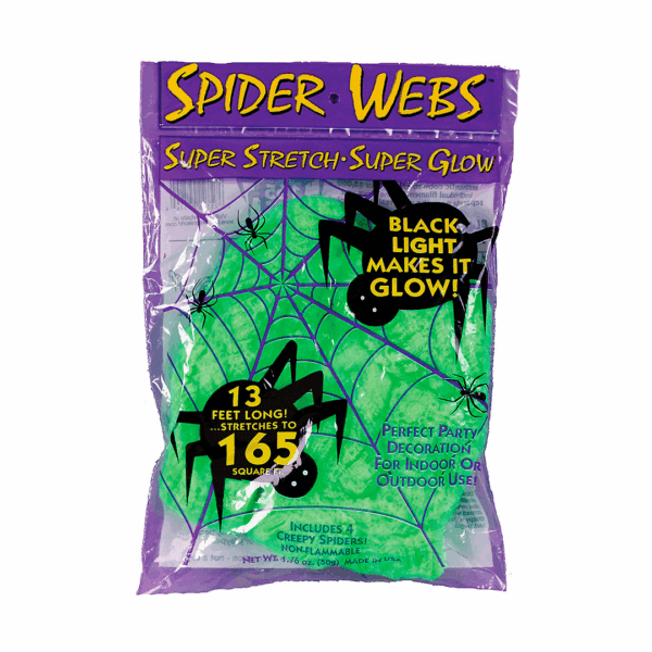 Decoración de telaraña verde brillante súper elástica de 165 pies. Extiéndela sobre un área específica para lograr un aspecto espeluznante y embrujado. En bolsa de polietileno y con mecha. 50 g