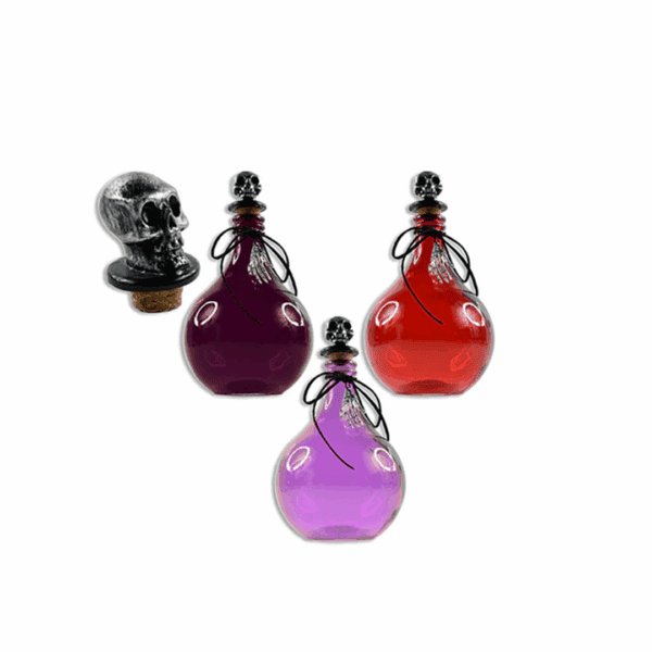Botella decorativa de vidrio para Halloween con tapón de calavera y cierre de esqueleto. Tamaño de 5,88″.