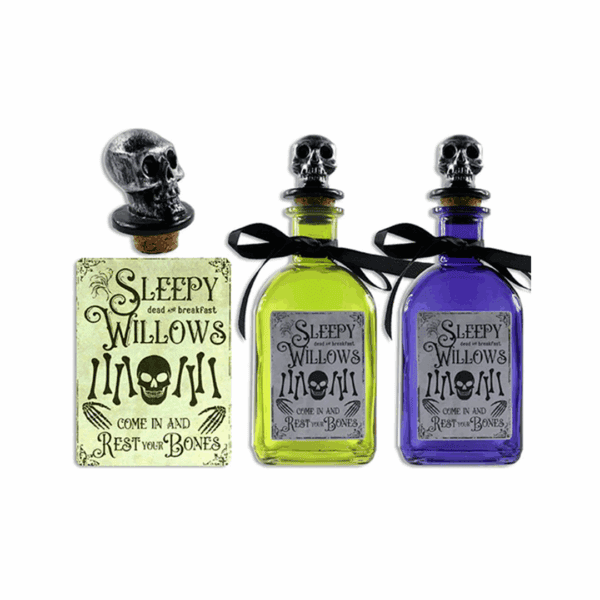 Botella de veneno de cristal para Halloween con tapón de calavera y cinta de satén