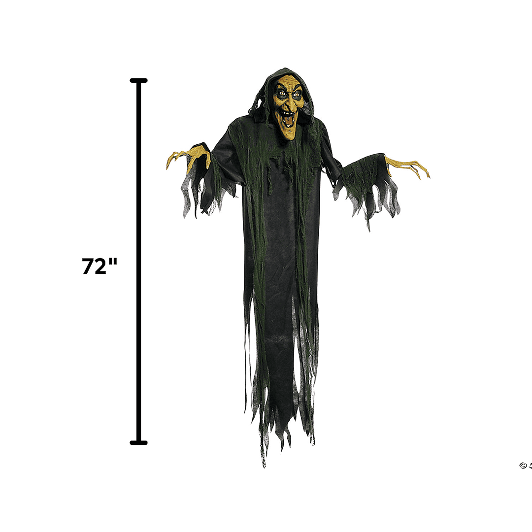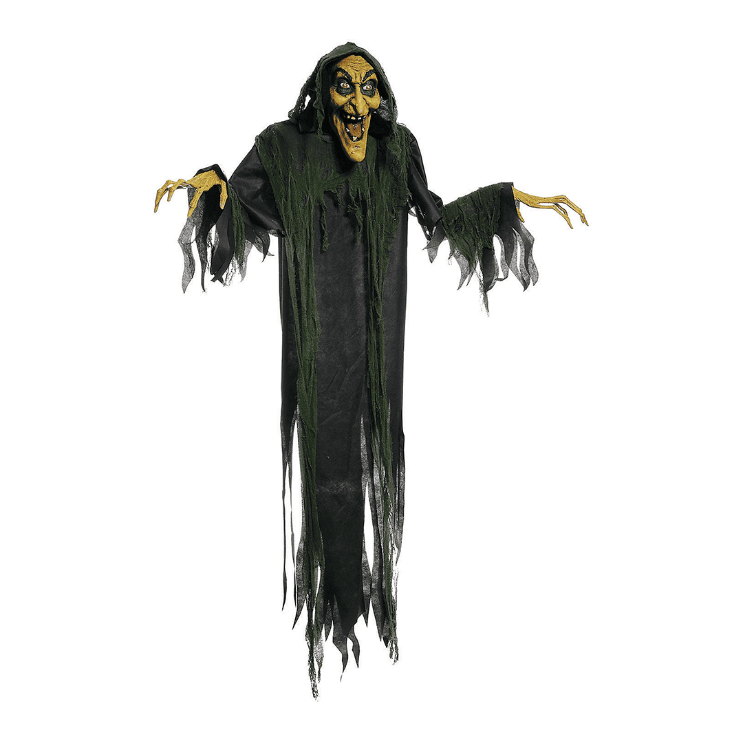 Bruja Colgante, decoración de Halloween con una altura de 1,83 metros. Cuenta con cabeza y manos alargadas moldeadas por soplado con brazos articulados, ojos iluminados y un disfraz andrajoso con capucha y detalles de gasa. Un sensor de sonido la activa y dice: “Ah-ha, another tasty morsel for my stew” (“¡Ajá, otro bocado delicioso para mi guiso!”).
