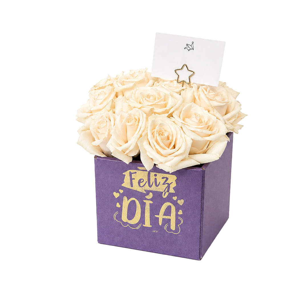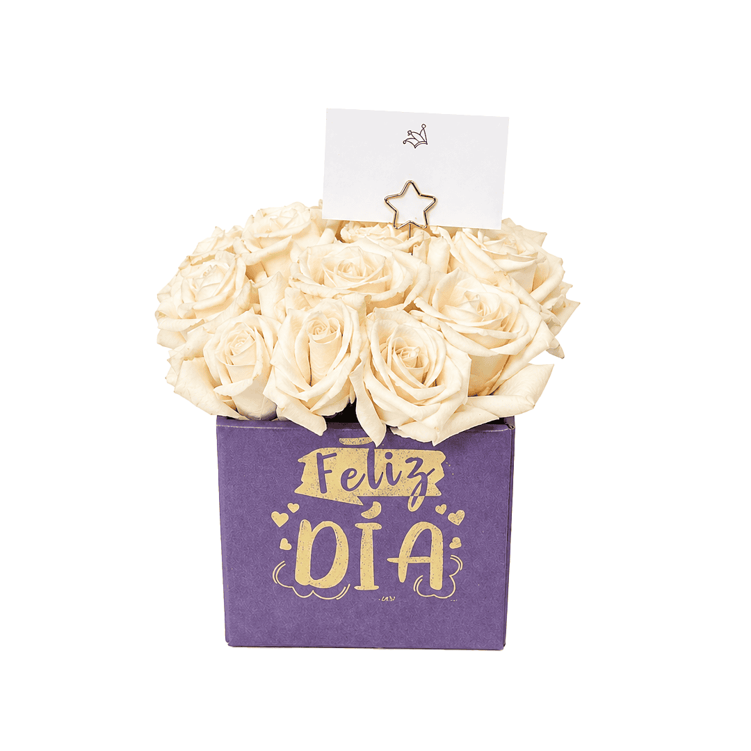 Caja de 12 rosas blancas, incluye: 12 rosas naturales, en caja de cartón cuadrada con textura, tarjetita. Nota: El color de las flores, y caja puede variar según disponibilidad en tienda. El precio de los ramos puede variar según temporada del día de cariño o día de la madre.