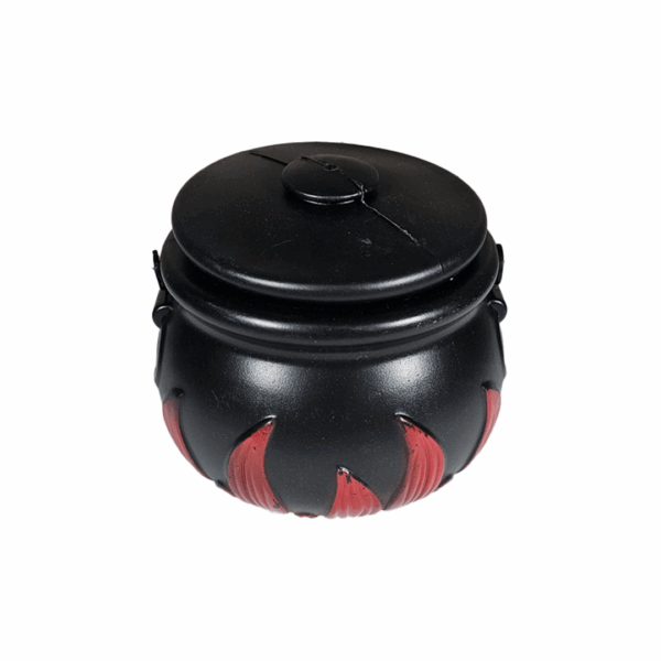 Contenedor de dulces: Caldero para dulces con llamas rojas y rapadera. útil para repartir en Halloween.