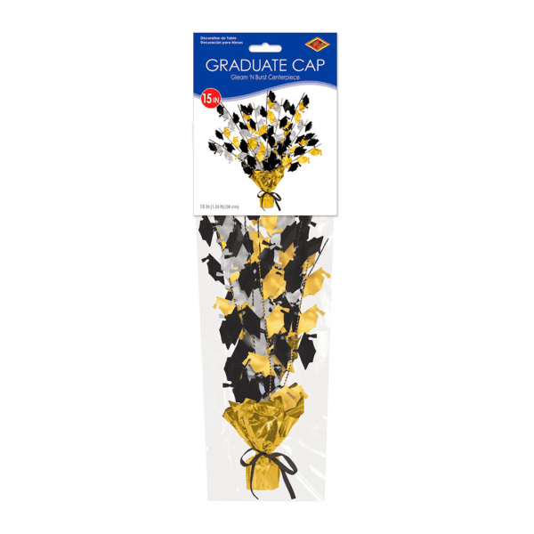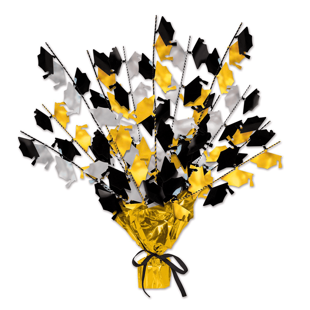 Centro de mesa con birretes metalicos, multicolro metálico.