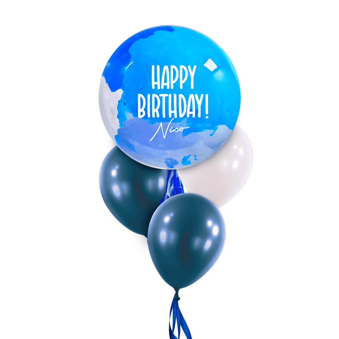 Bunch con helio de globos burbuja (con pintura, confeti, globos o micro perla) con personalizado de tres palabras + tres globos látex de color solido a elección. Incluye peso y tassel. Ideal para fiesta de cumpleaños, regalo o decoración.