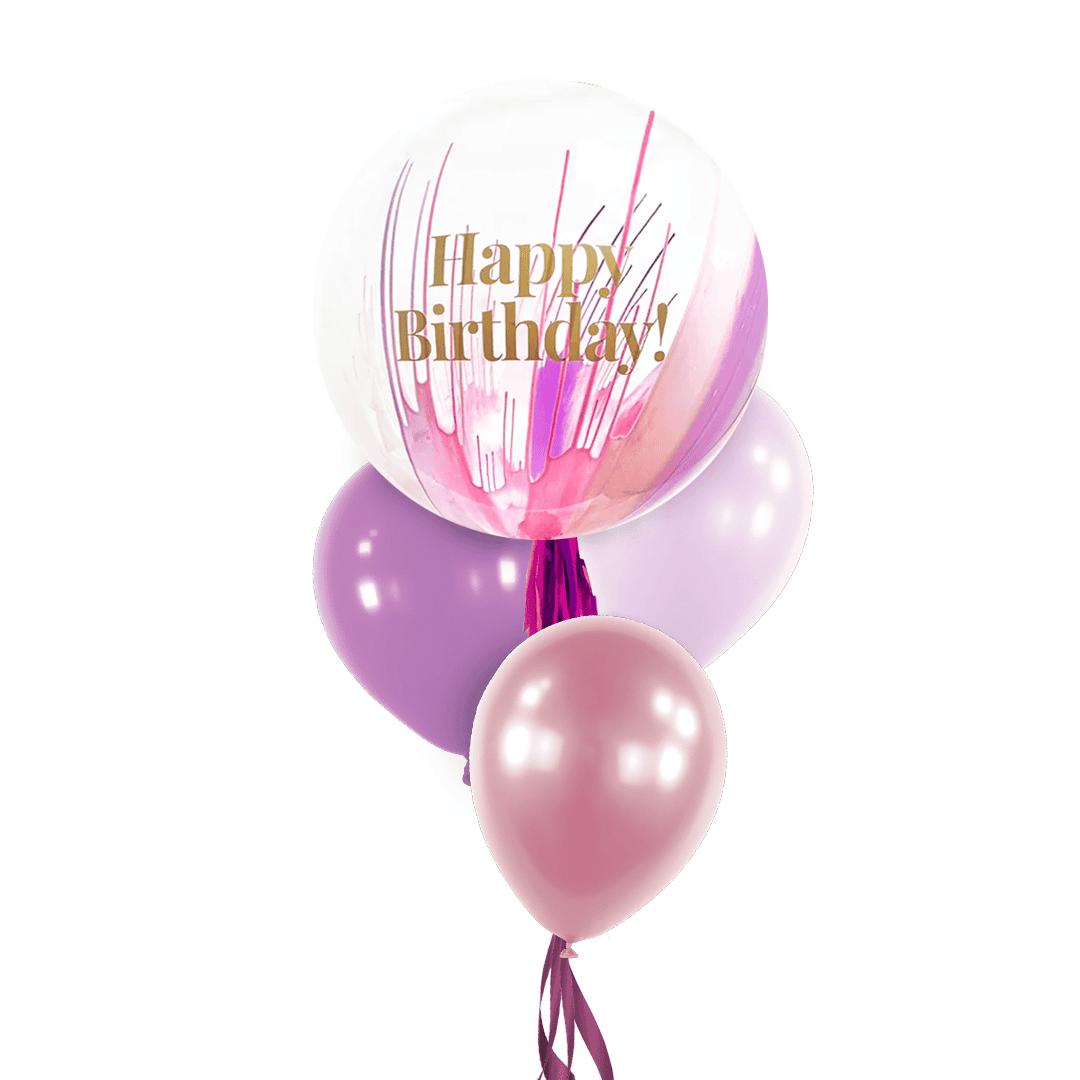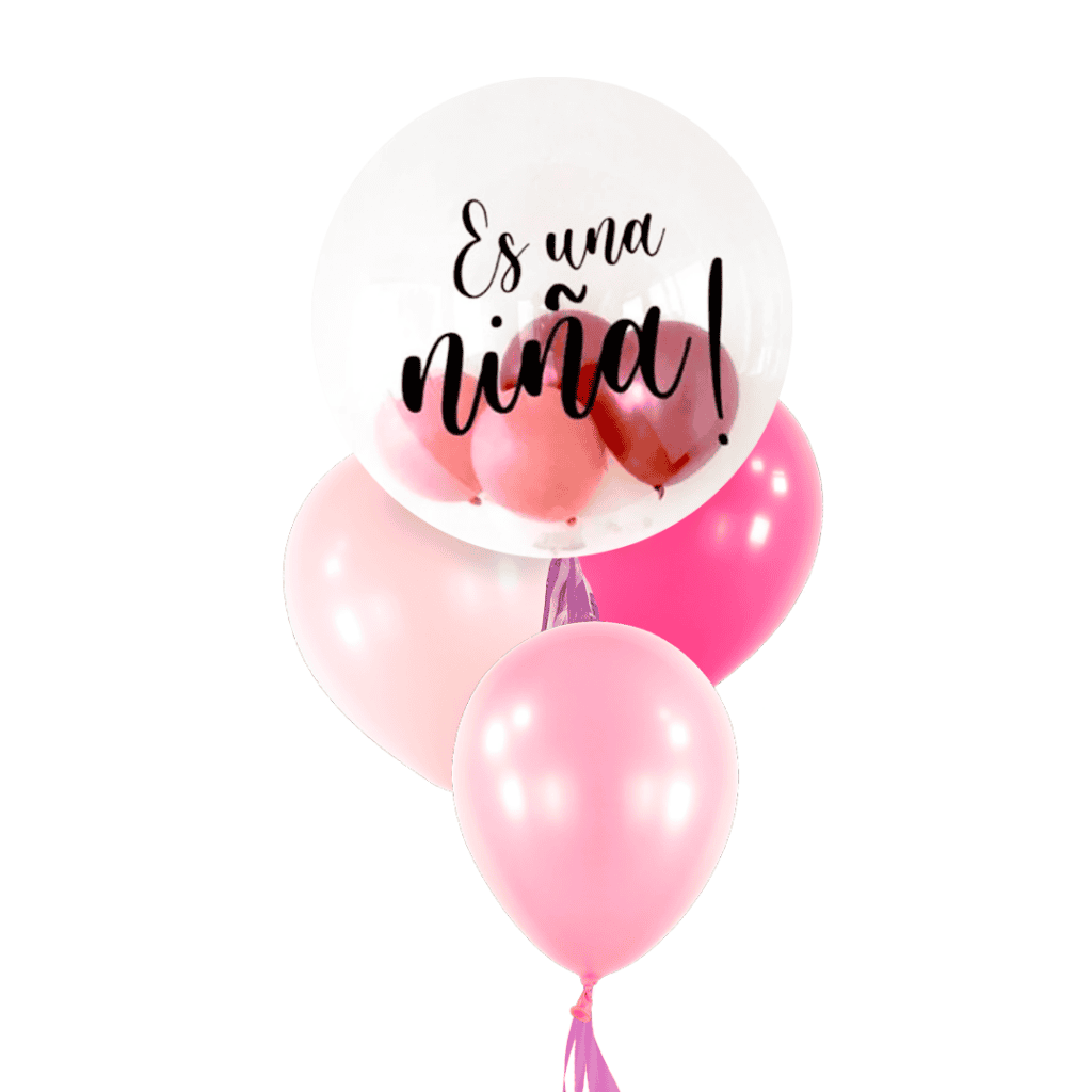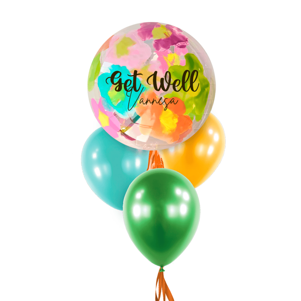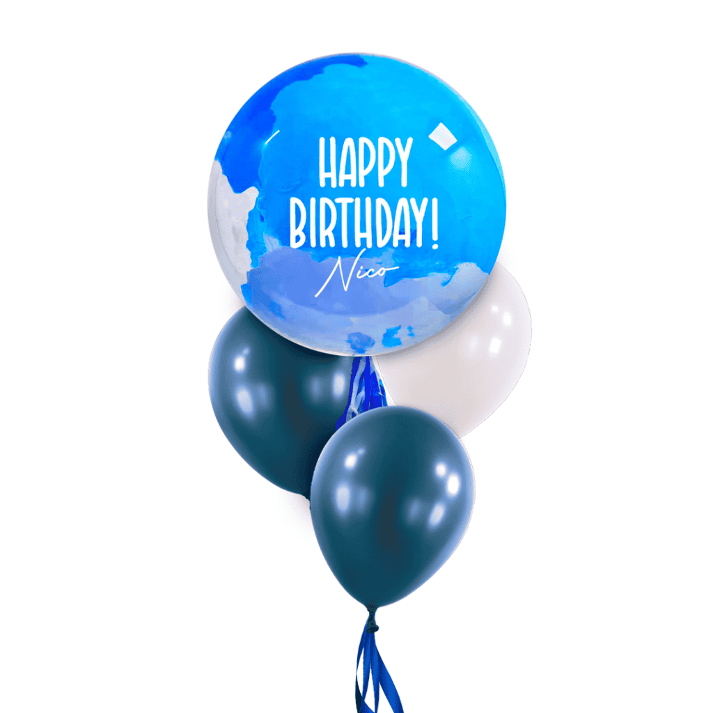 Bunch con helio de globos burbuja (con pintura, confeti, globos o micro perla) con personalizado de tres palabras + tres globos látex de color solido a elección. Incluye peso y tassel. Ideal para fiesta de cumpleaños, regalo o decoración.