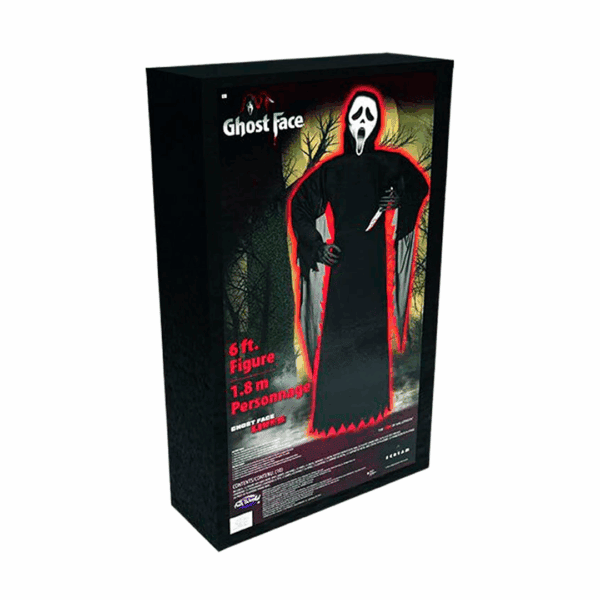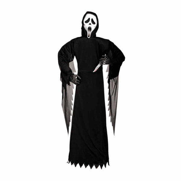 1 figura con cuchillo (incluye cabeza, cuerpo, manos y bata) 1 soporte de metal 1 soporte de metal con cubo de plástico 2 conectores de plástico 4 pies de plástico para base. Tamaño: 6 pies de Alto