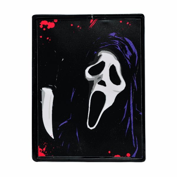 Letrero luminoso de neón con diseño de ghost face. Funciona con botón pulsador. 28 cm de alto x 21 cm de ancho x 6 cm de profundidad.
