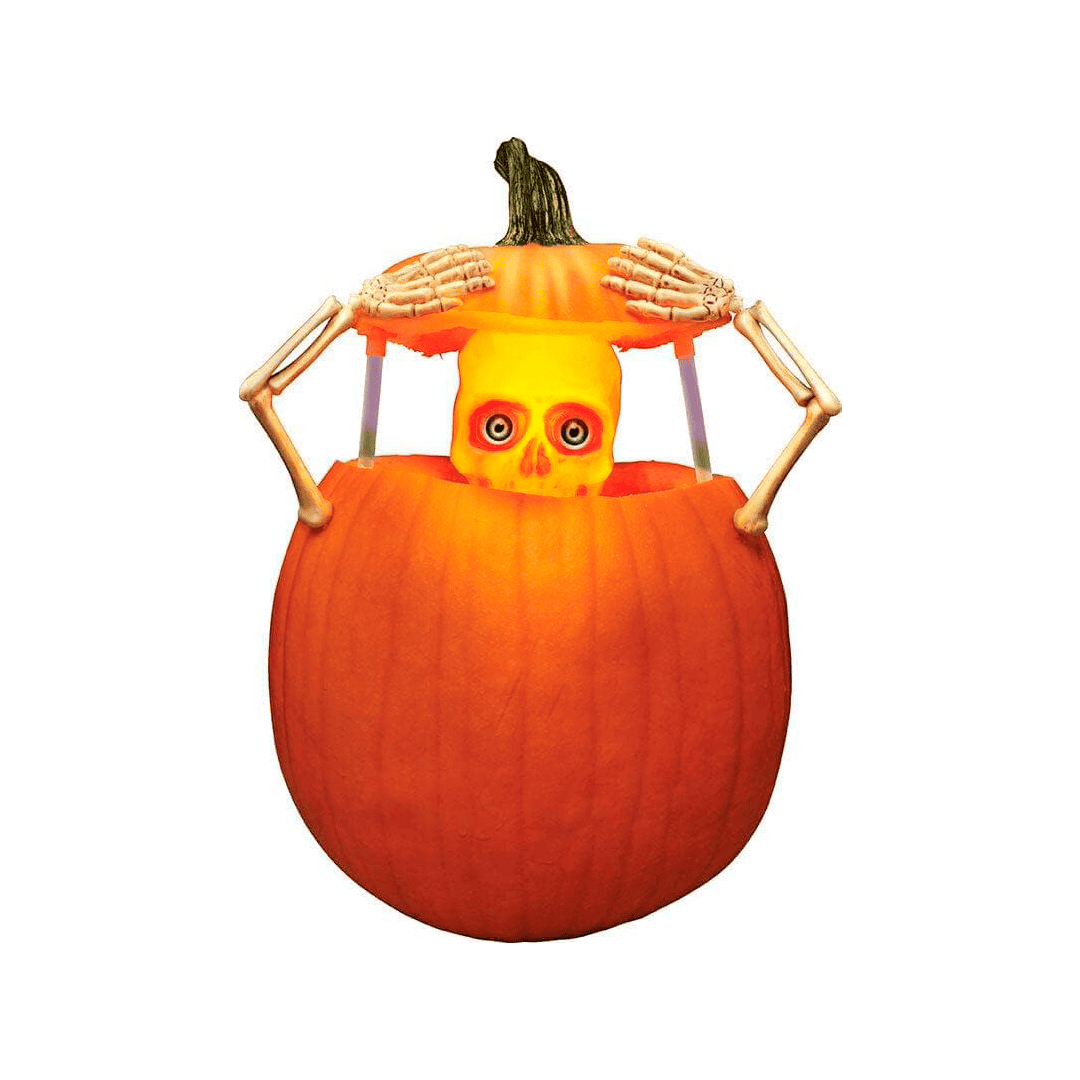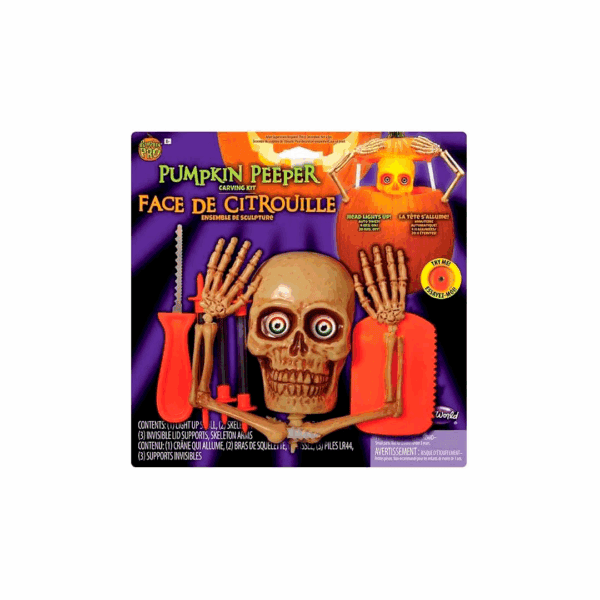 Kit para decorar calabazas. Incluye: 1 calavera con temporizador automático, 2 brazos, 3 soportes para tapa, 1 pala, 1 tallador.