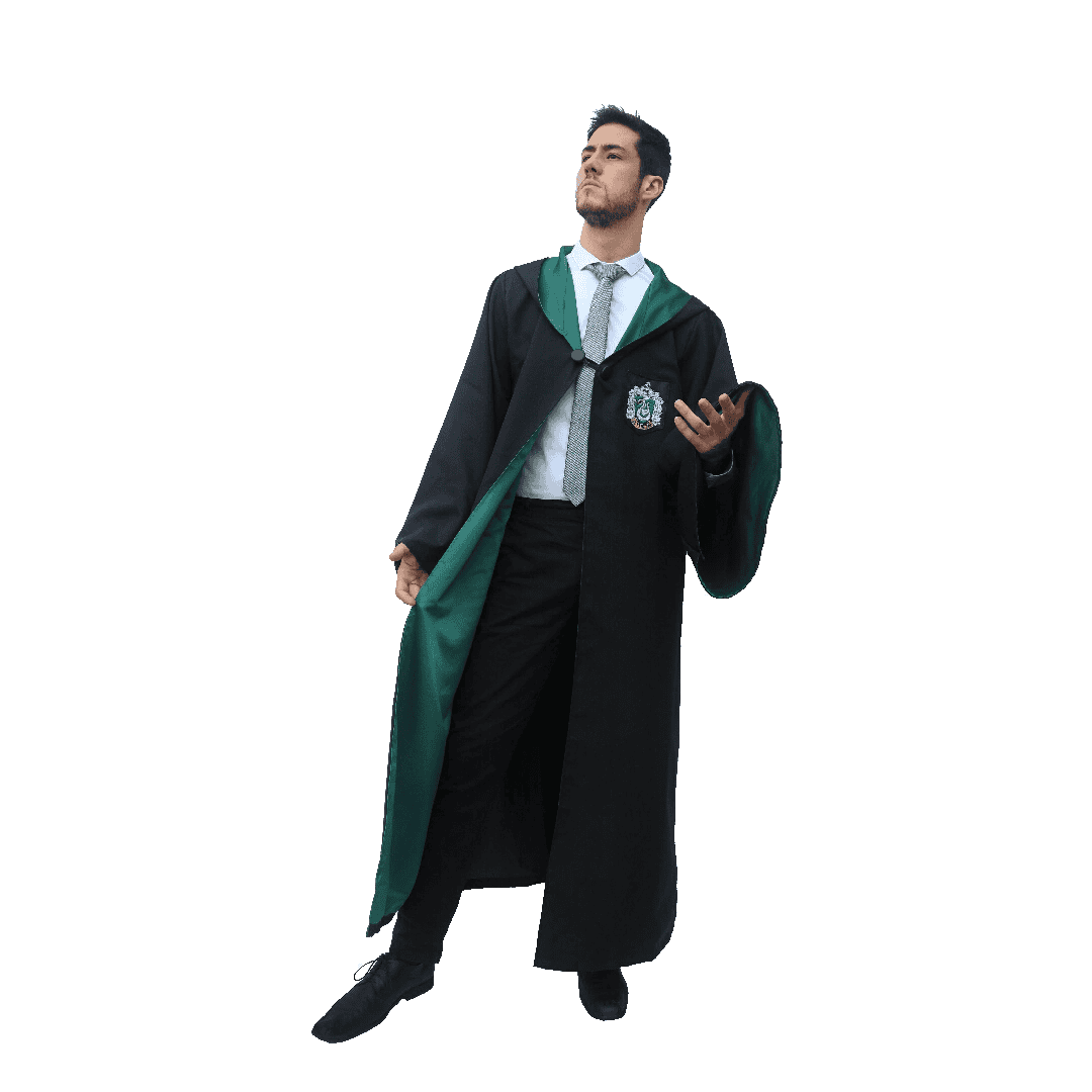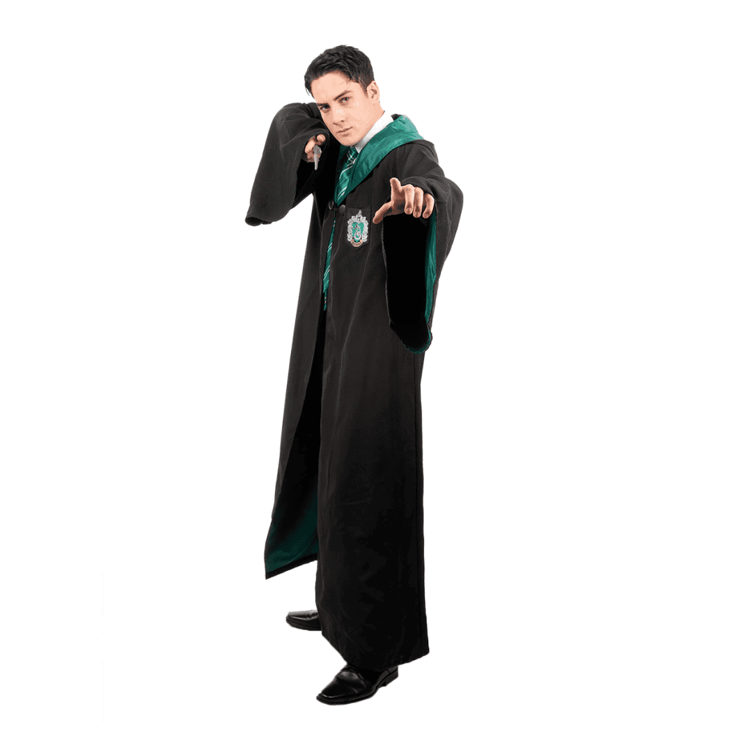 Disfraz talla L. El disfraz de Harry Potter Robe Slytherin te convertirá en un auténtico mago oscuro. La túnica larga y negra cuenta con detalles en verde, el color de la casa Slytherin, y presenta una capucha que te ayudará a esconderte en las sombras. Además, el escudo de la casa Slytherin se encuentra en el pecho, mostrando tu astucia y ambición. Únete a Draco Malfoy y sus amigos en este traje de Harry Potter que te permitirá demostrar tu habilidad para las artes oscuras.