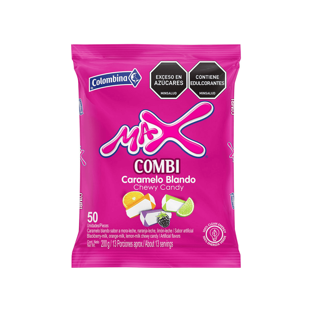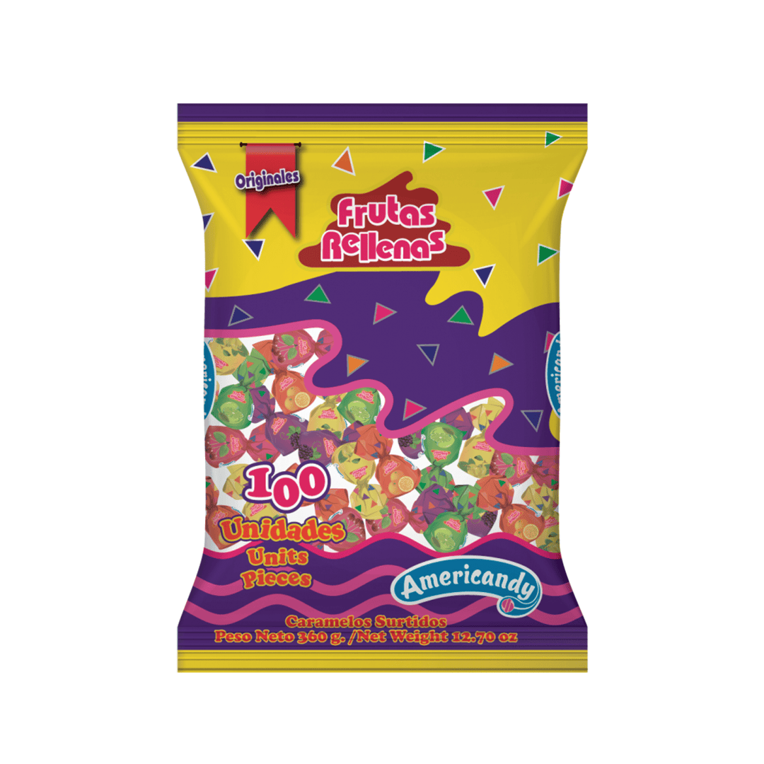 Frutica rellena Americandy, dulce duro, sabor mayacuyá, cereza, lima, naranja y uva. Paquete de 100 unidades.