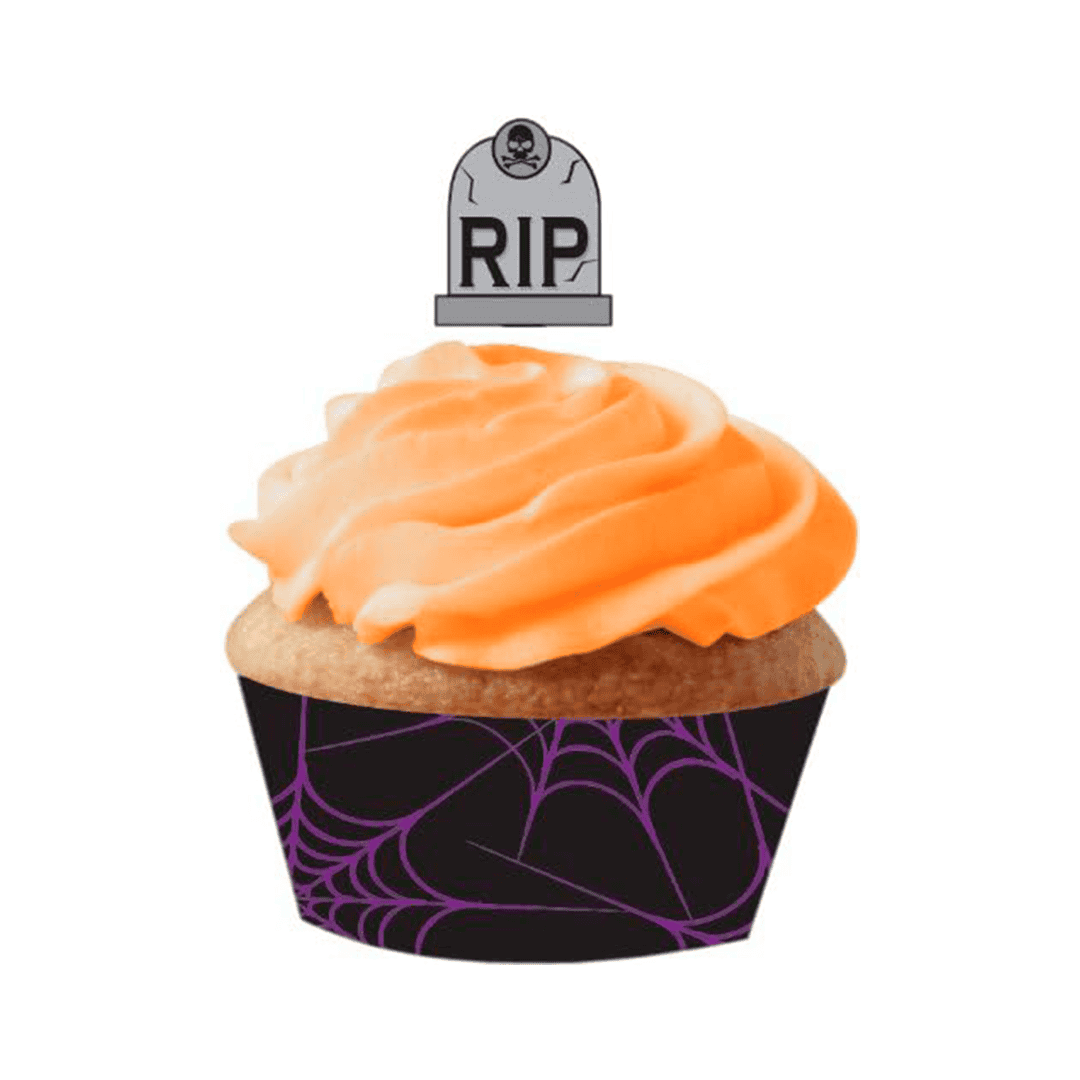 12 envoltorios para cupcakes con púas de lápida de plástico, telarañas de Halloween