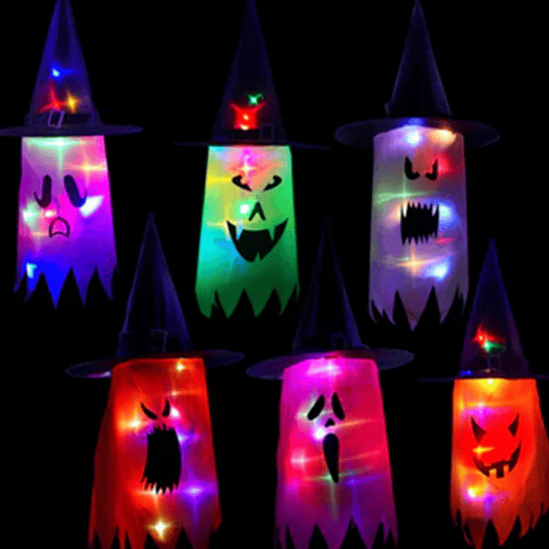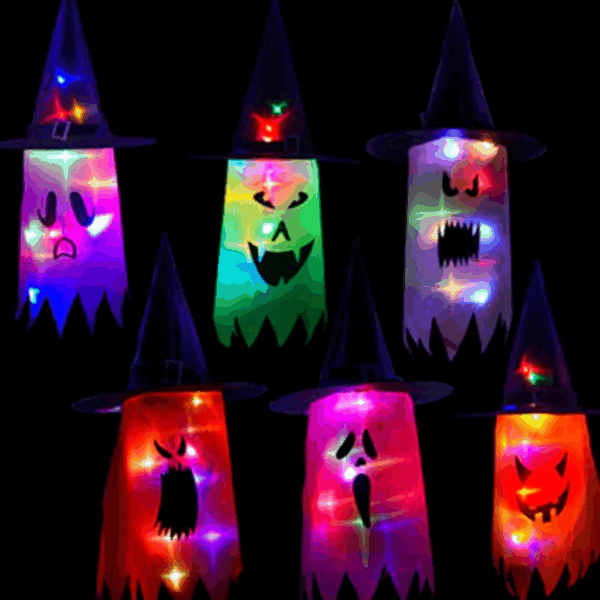 Fantasma colgante de Halloween funciona con pilas y se ilumina con luces LED. Colores surtidos. Tamaño: 73 x 33 cm.
