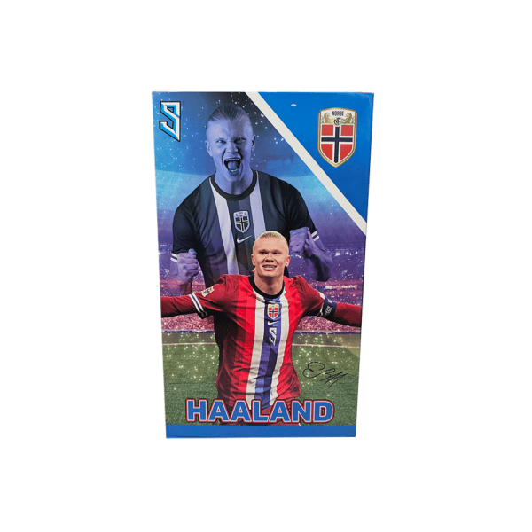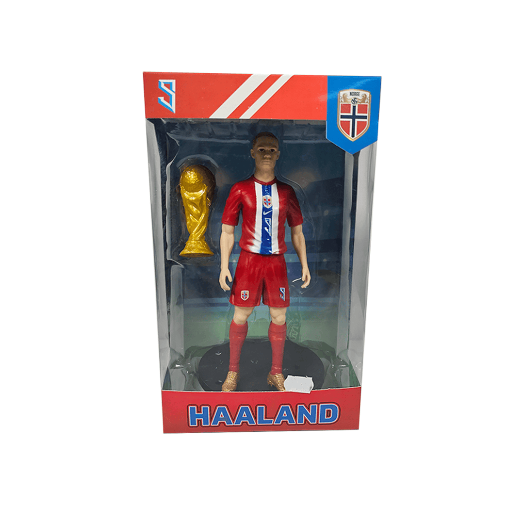 Figura colecciónable del jugador Haaland con copa mundia y uniforme de Noruega, 1 unidad.