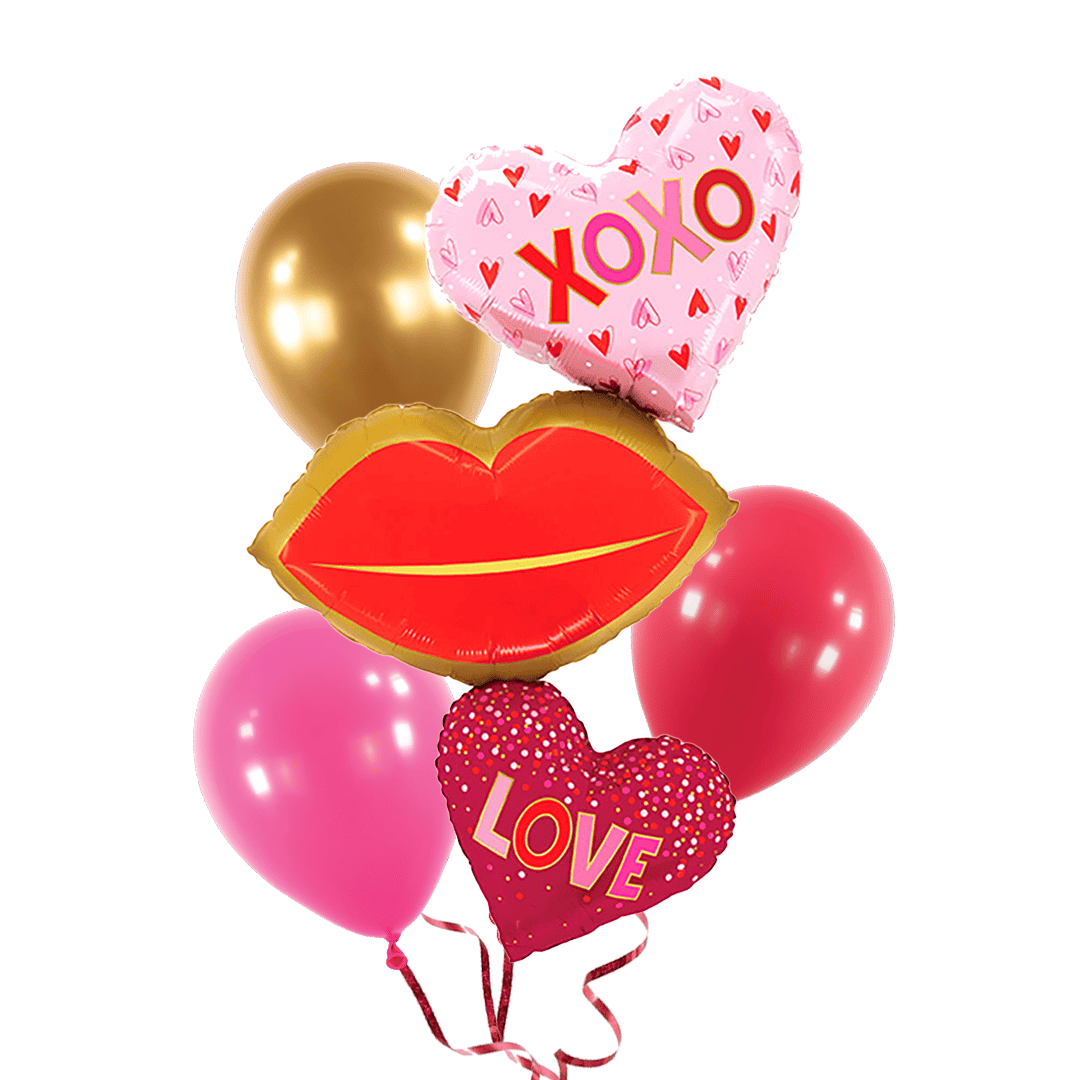 Bunch con helio incluye: Globo metálico trio de labios, San Valentín 40″ + 3 globos látex de 12″ (colores a elección) y peso para globos. 030625253291. Nota: el precio es exclusivo para compra en sitio web. Puede agregar la elección de colores en el check out.