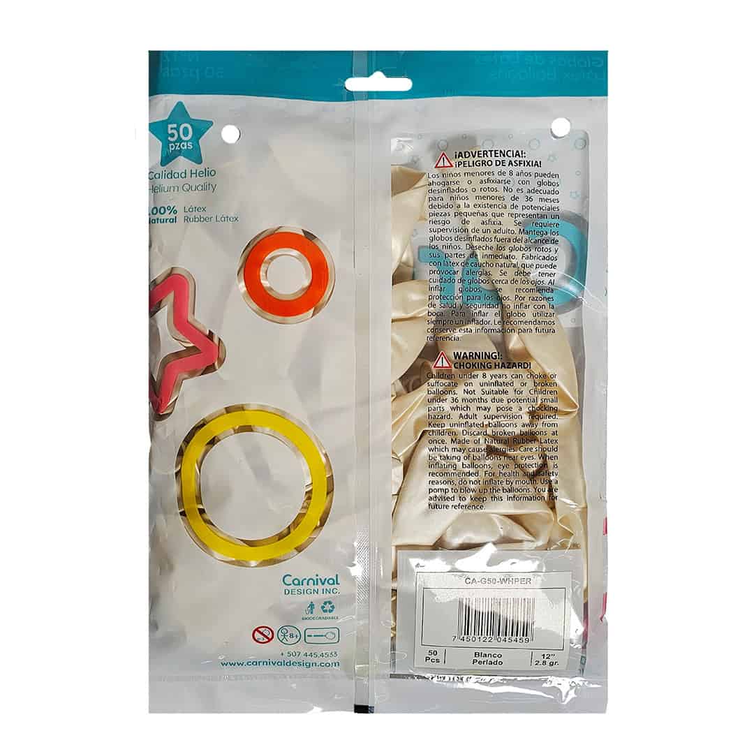 Globo látex 12″ color blanco perlado, paquete de 50 unidades, ideal para baby shower, primera comunion, boda, aniversario de boda, bridal shower.