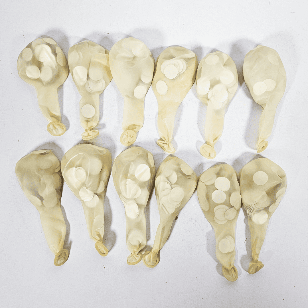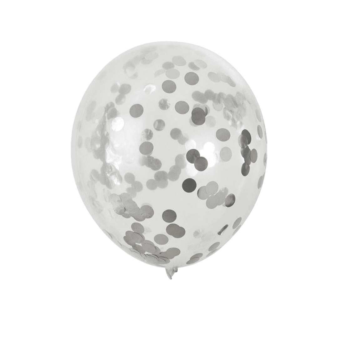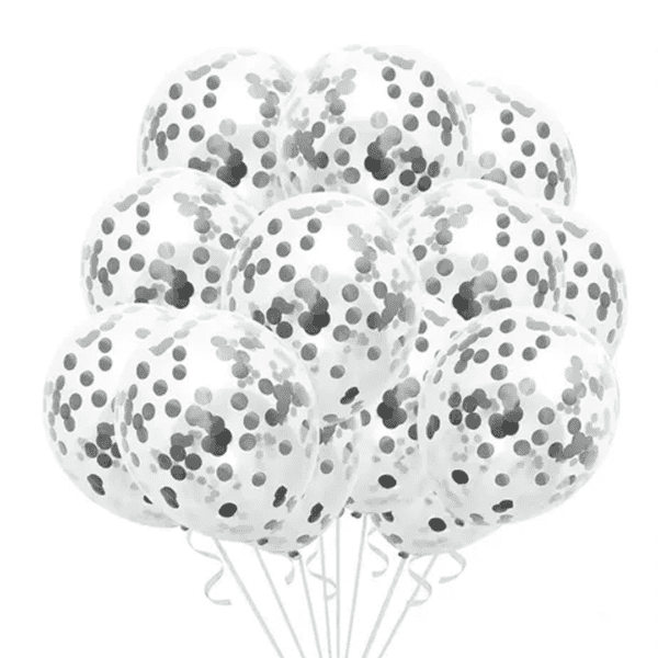 Bolsa de 12 globos transparentes de látex de 12″ con confetti color plata. Nota: No incluye helio.