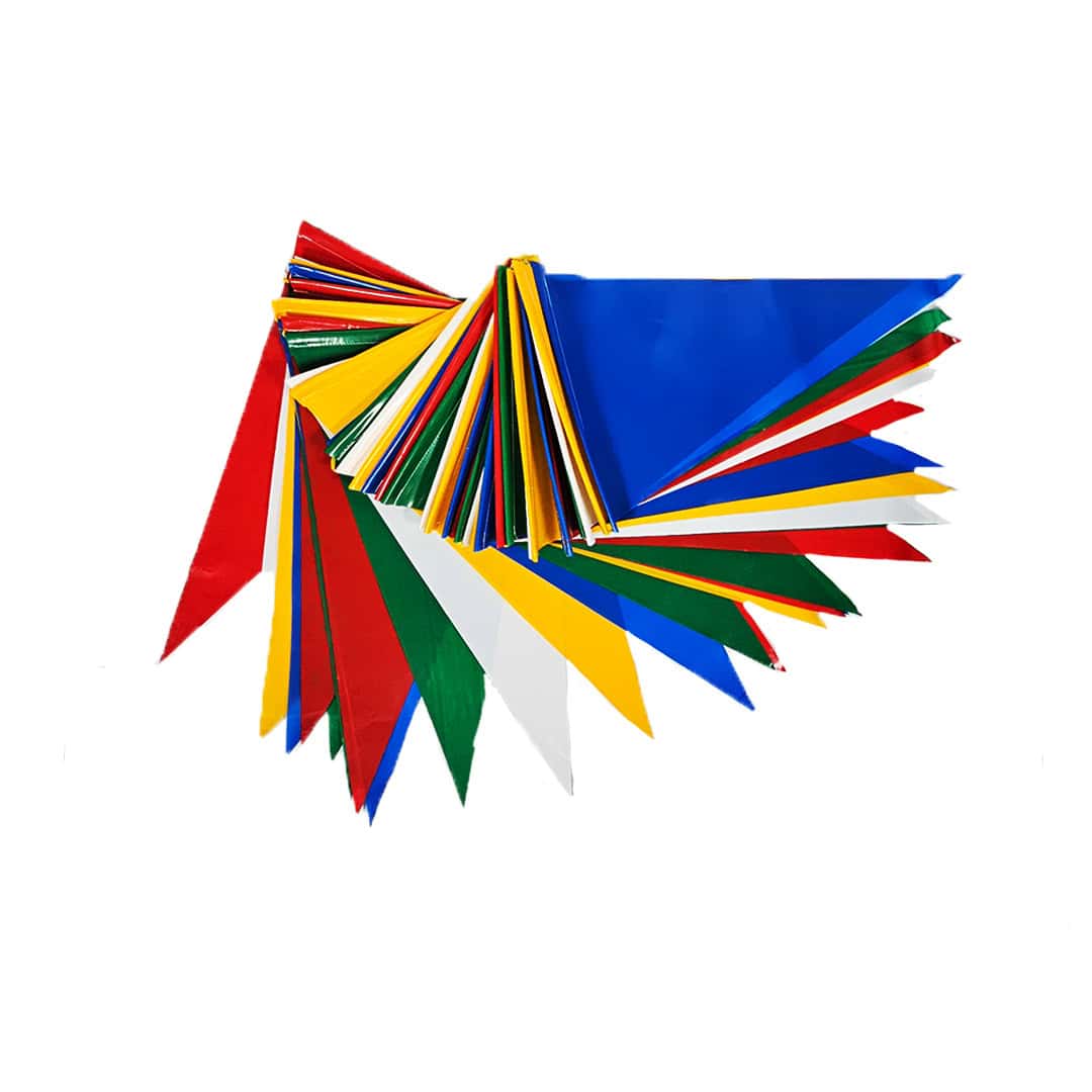 Guirnalda de banderines de plástico multicolor, ideal para decorar espacios, cumpleaños, negocios. 1 unidad.