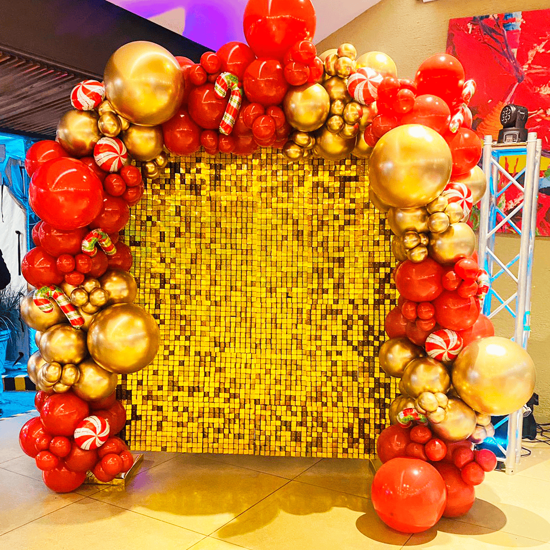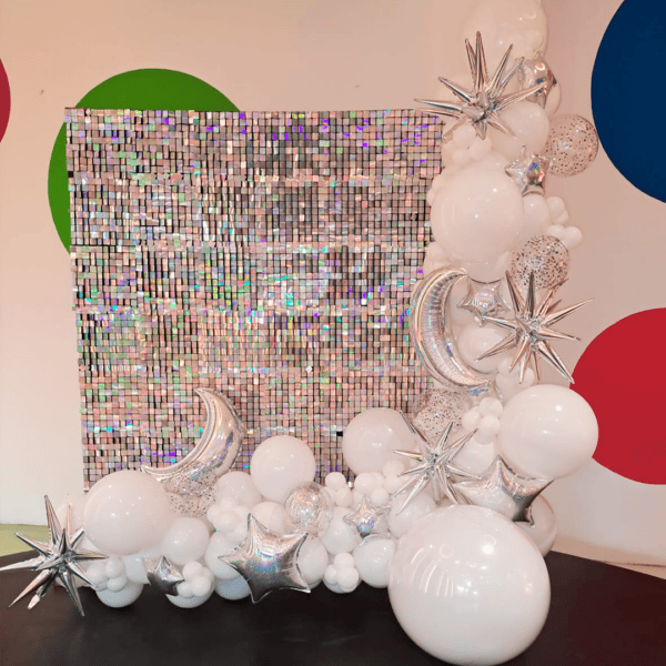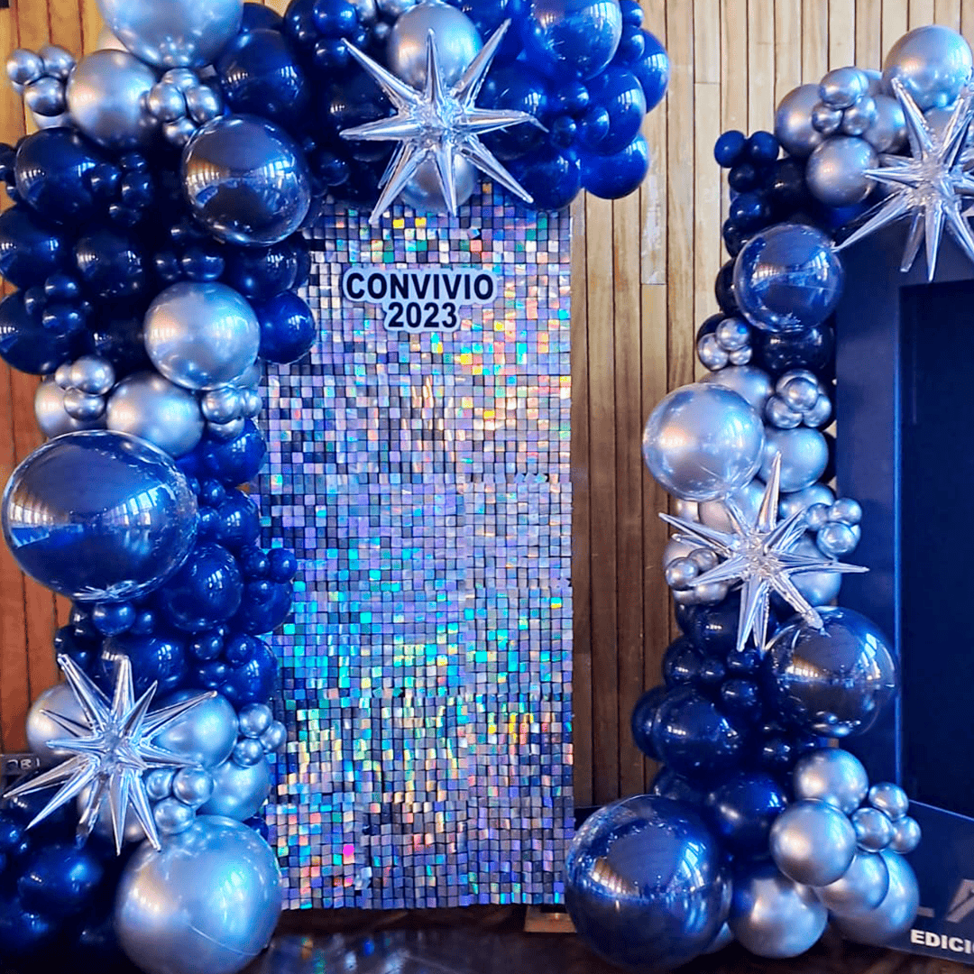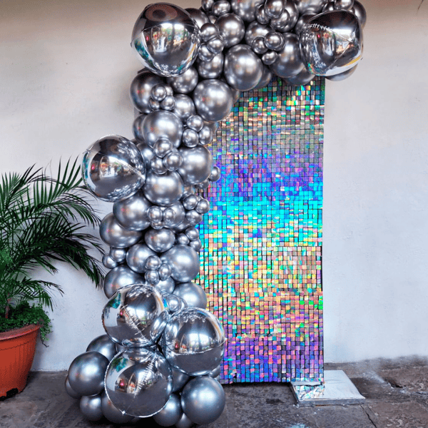 Guirnalda de globos látex + Shimmer back. El precio varía según el tamaño y tipo de la guirnalda. De igual forma el Shimmer Back puede variar de tamaño según se necesite. ¡Cotiza la tuya hoy!