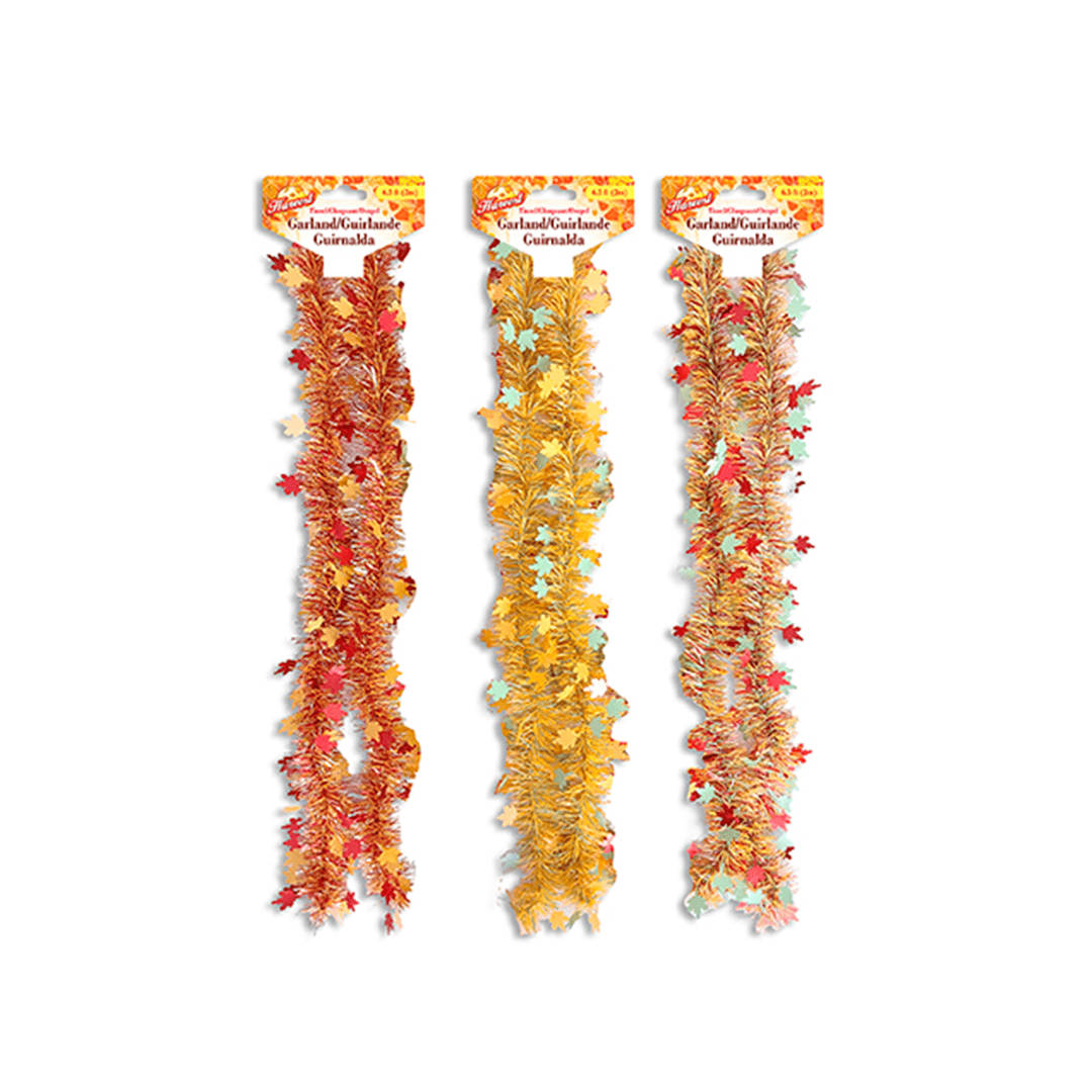 Guirnalda de oropel mate multicolor con hojas de arce de 6,5 pies x 5 capas. Puntas de 3,94 pulgadas. 3 diseños surtidos. Nota: Este producto es de presentación surtida, por lo que podrías recibir cualquiera de sus variaciones. Si prefieres un diseño específico, indícalo en tu pedido; se enviará según disponibilidad.