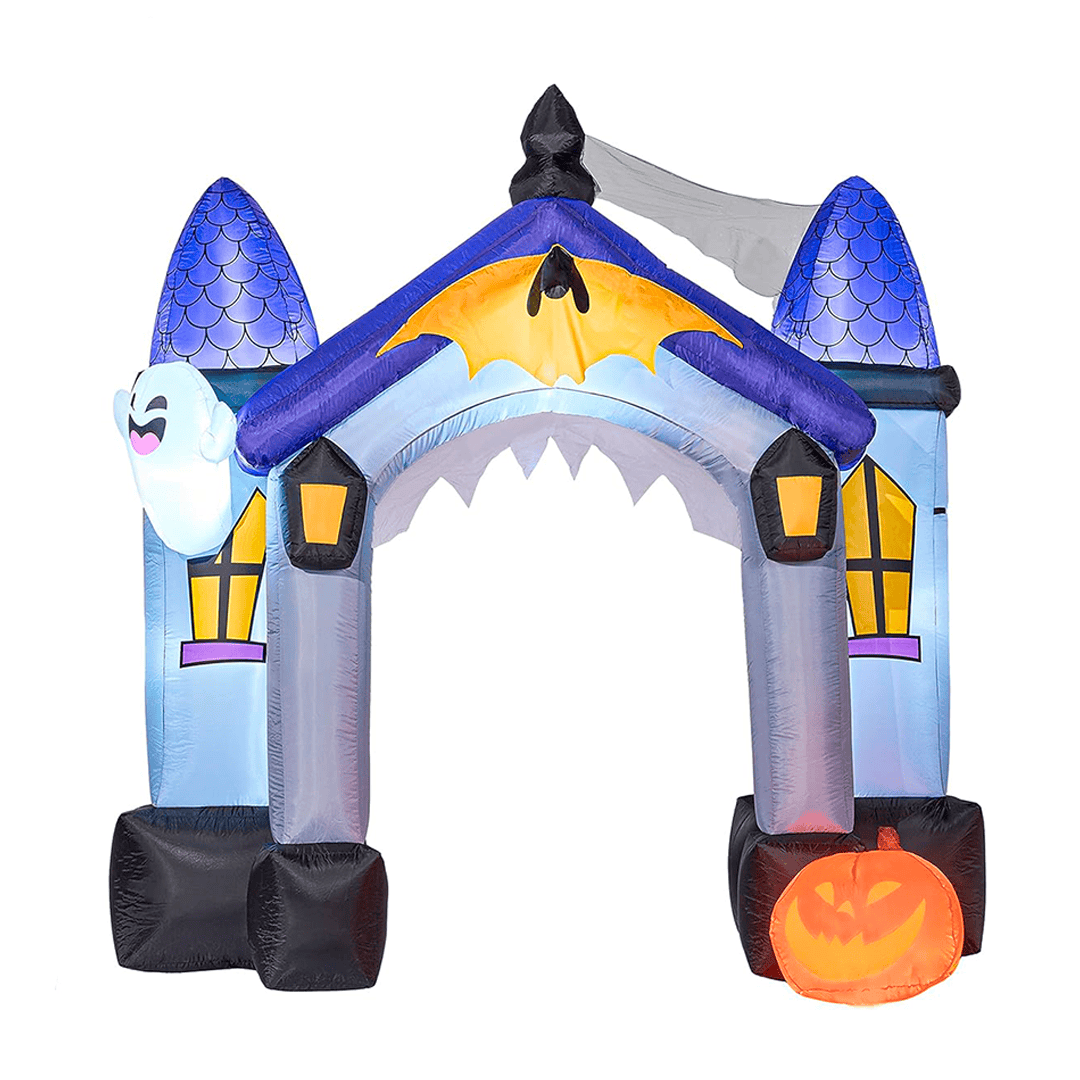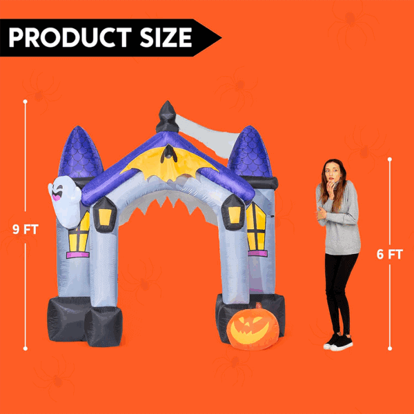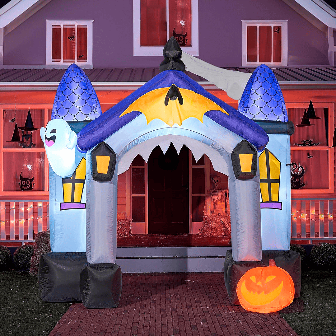 Casa embrujada inflable con arco y luces LED integradas, 9 pies de altura, decoración de patio para fiesta de Halloween, interior, exterior, patio, jardín y decoración de césped.