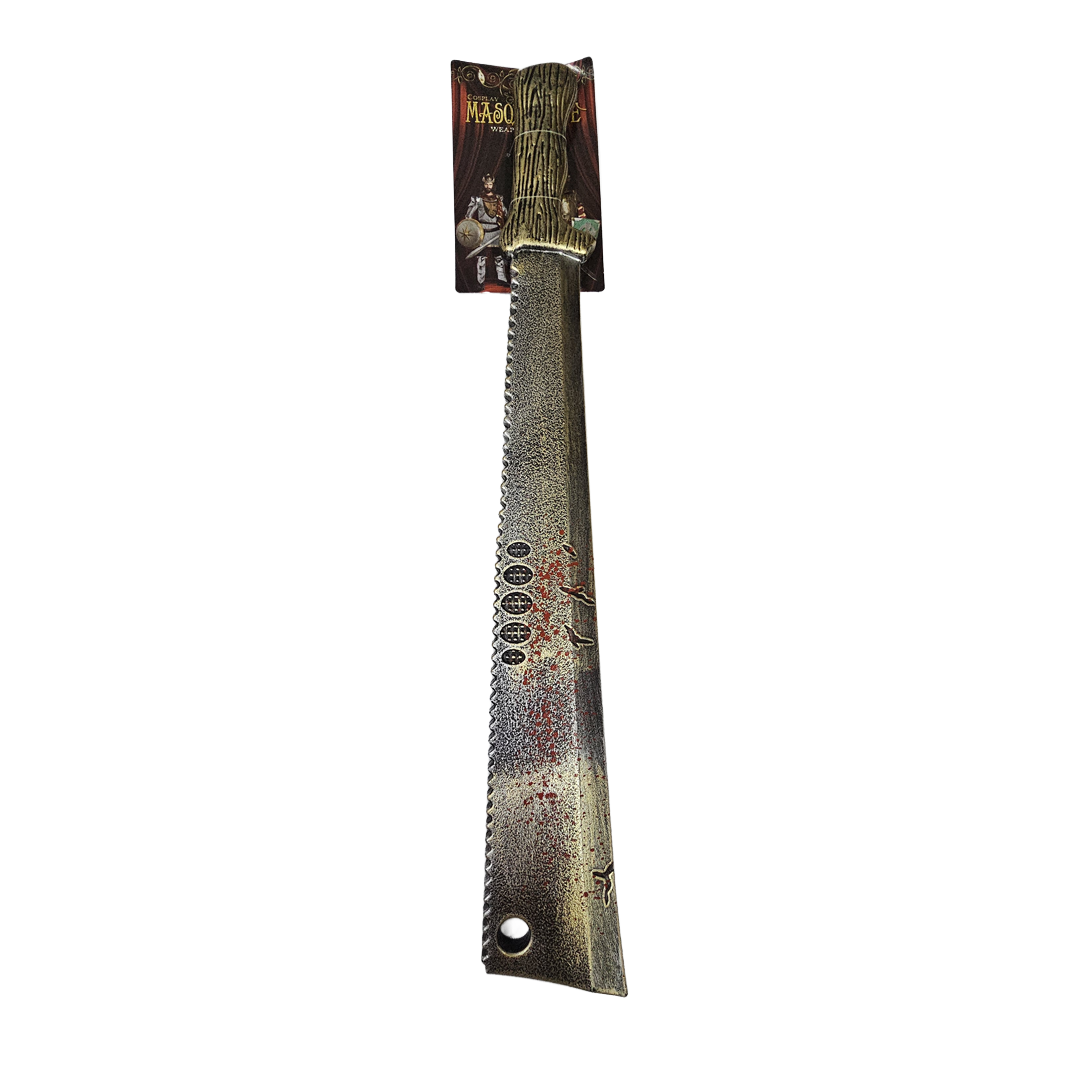 Accesorio de utilería de terror: Machete de sierra. para disfraces o ambientación.