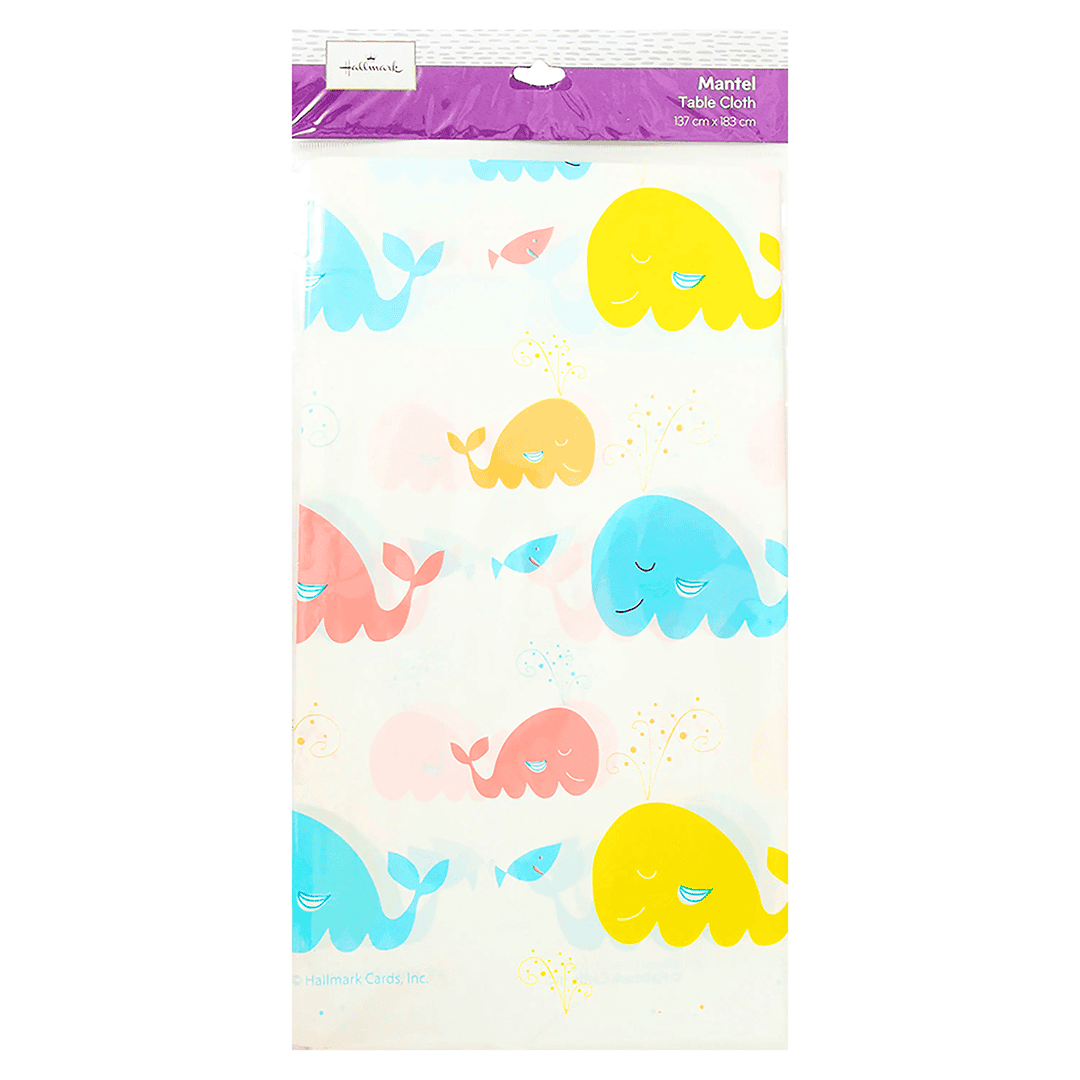 Mantel baby shower, con diseño de ballenas multicolor. Tamaño 137×183 cm
