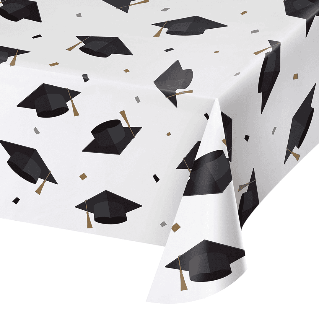 Los manteles desechables de papel presentan un patrón integral de birretes de graduación y confeti. Miden 96 x 54 pulgadas