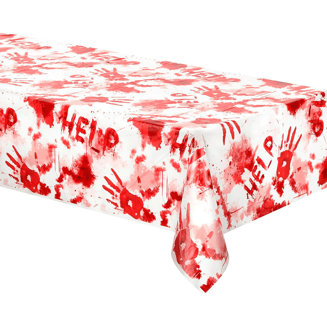 Mantel Plástico sangriento. Cuenta con huellas de manos sangrientas y salpicaduras de sangre impresas sobre un fondo blanco. Material hecho de plástico resistente perfecto para uso en interiores o exteriores. Perfecto para fiestas de Halloween de 54 x 102 pulgadas.