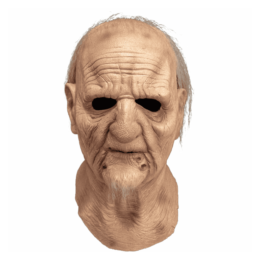 Máscara de látex Grandpa Mask de la línea The Texas Chainsaw Massacre. La máscara de Grandpa en “Masacre en Texas” es una reliquia del horror, una máscara que parece haber absorbido la esencia misma del miedo. Los pliegues y arrugas cuentan historias de décadas de pesadillas, y sus rasgos desdibujados evocan una figura sombría que acecha en los recuerdos.
