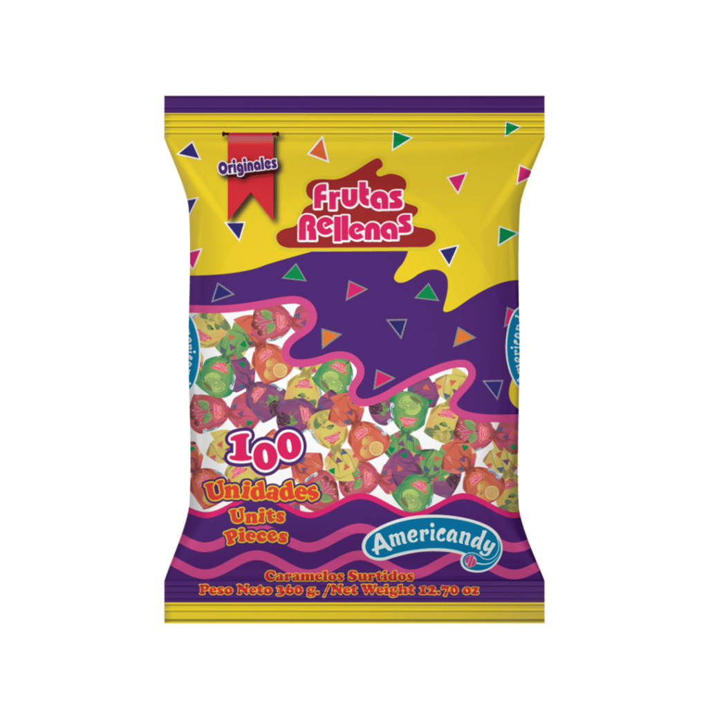Mini Bum Mango, caramelo relleno de chicle sabor mango 600 g. Paquete de 100 unidades.