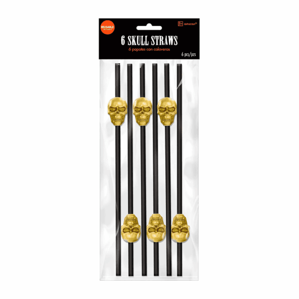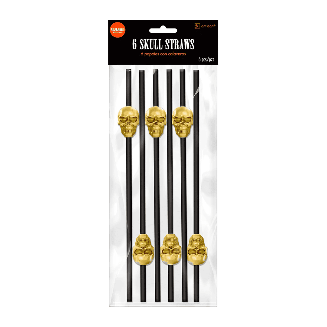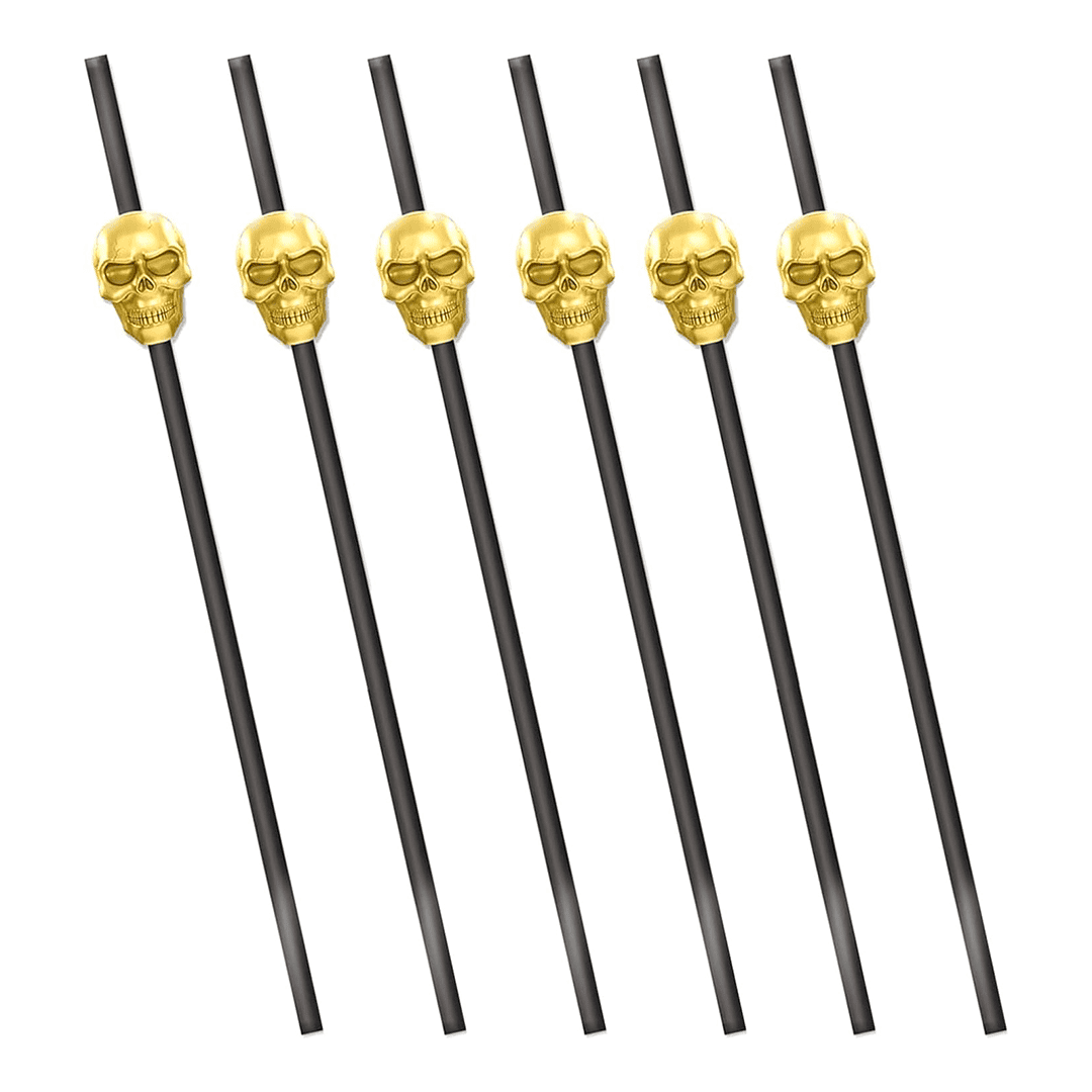 Pajillas reutilizables de plástico metálico negro y dorado con diseño de calavera, 11 pulgadas (paquete de 6), perfectas para Halloween, fiestas temáticas y celebraciones ecológicas