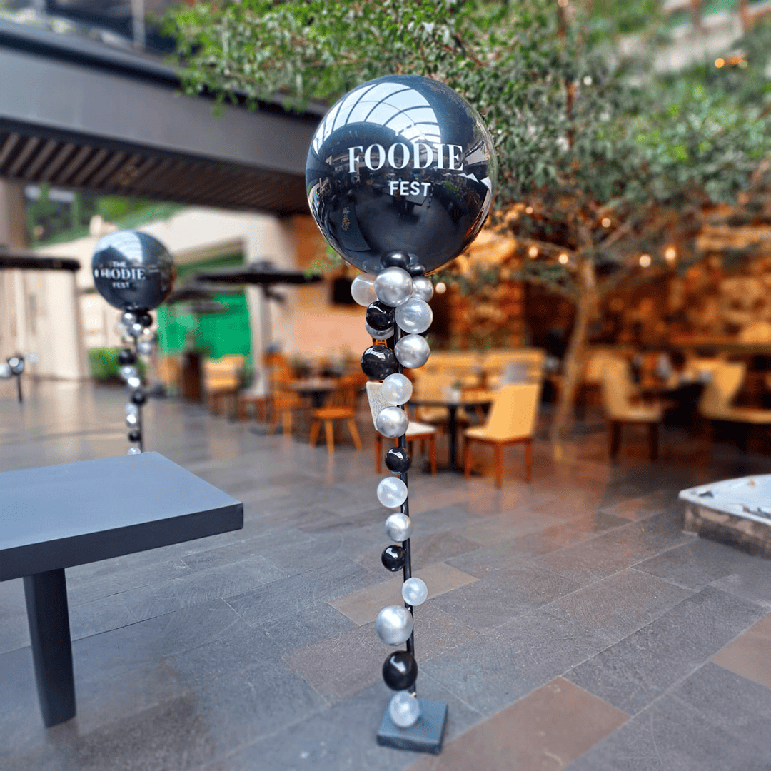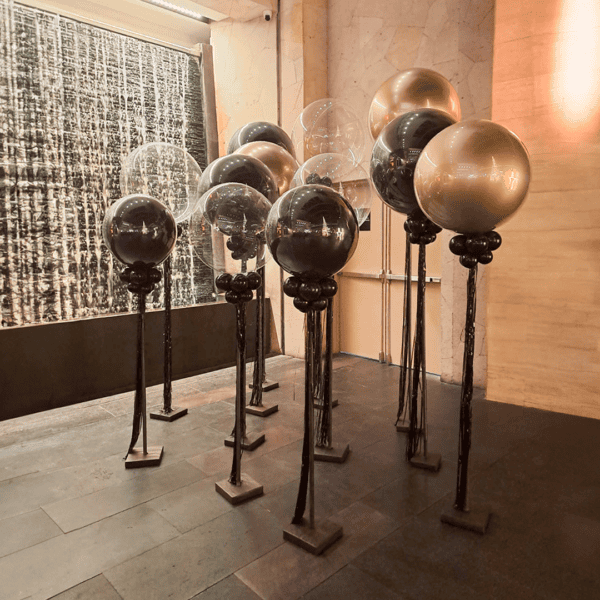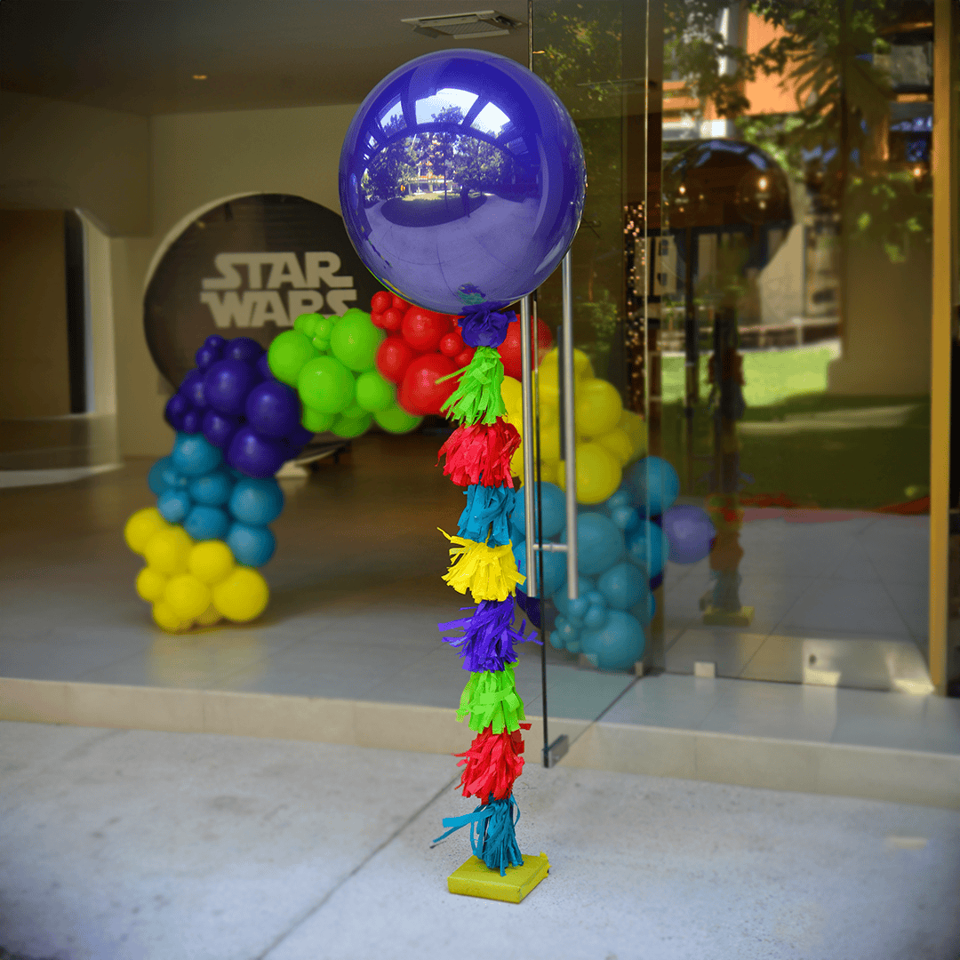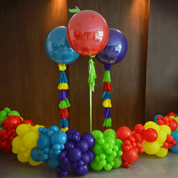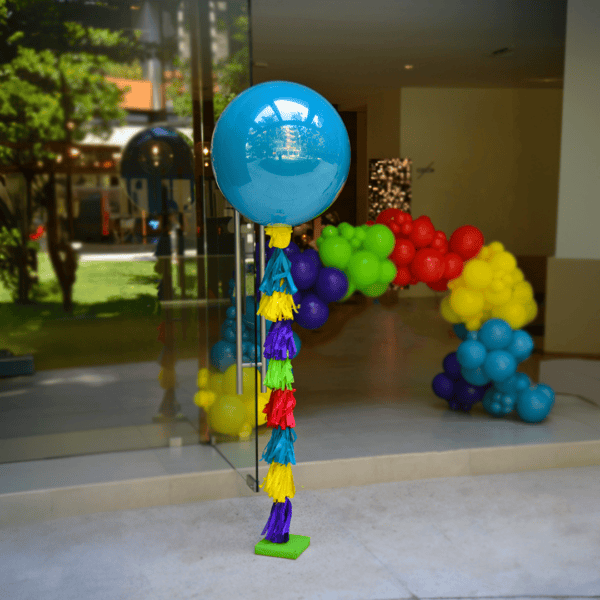 Paral con tassel o mini globos latex, acompañado de globo burbuja jumbo personalizado. ¡Cotiza la tuya hoy!