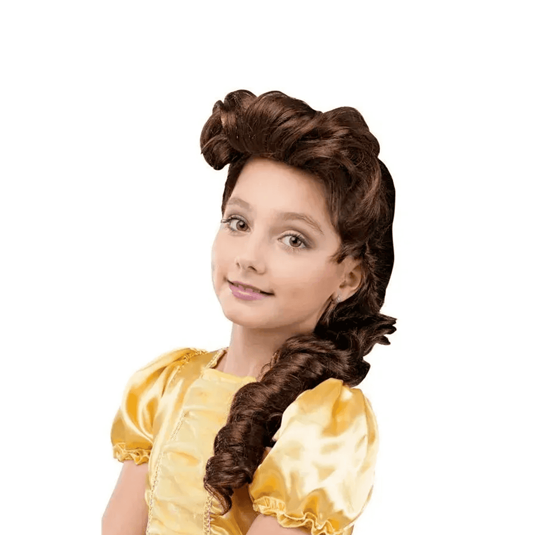 Peluca inspirada en el personaje de “Bella” de La Bella y la Bestia, diseñada para niñas. Fabricada con fibras sintéticas suaves y cómodas.